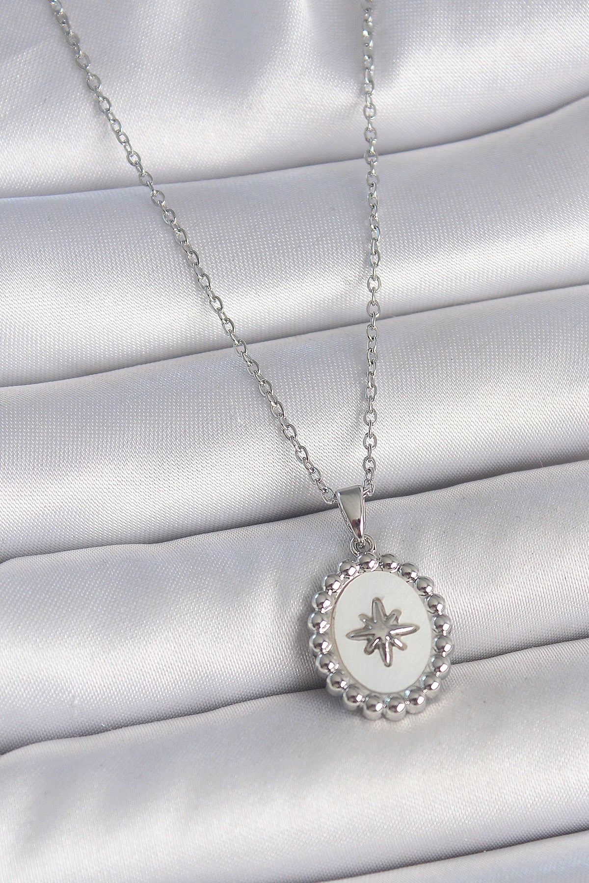 BKO10062 - 316L Çelik Gümüş Renk Zincir Beyaz Mineli Kutup Yıldız İşlemeli Madalyon Model Kadın Kolye