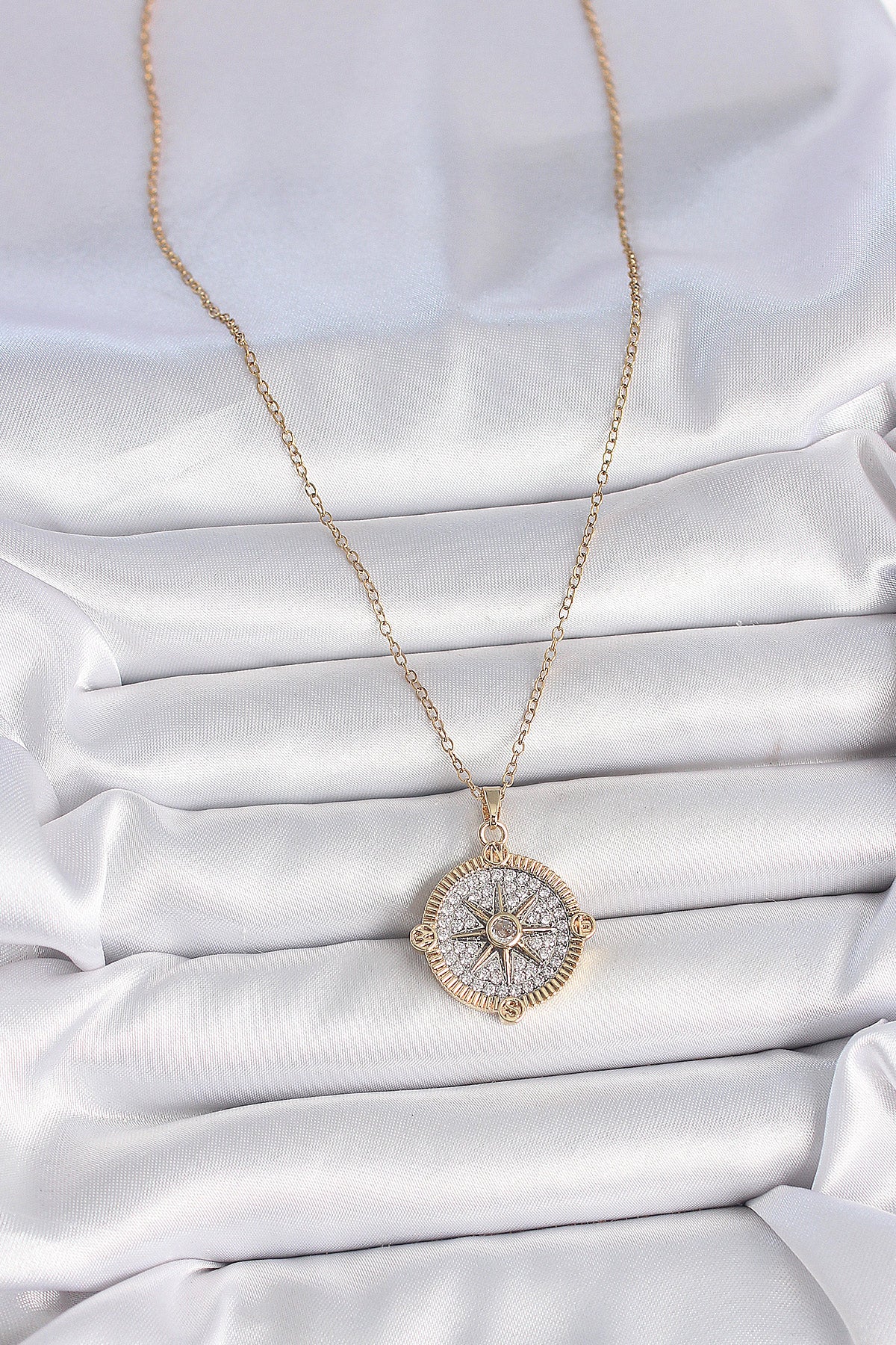 - Ürün Adı: 316L Çelik Gold Renk Zirkon Taşlı Pusula Model Kadın Kolye