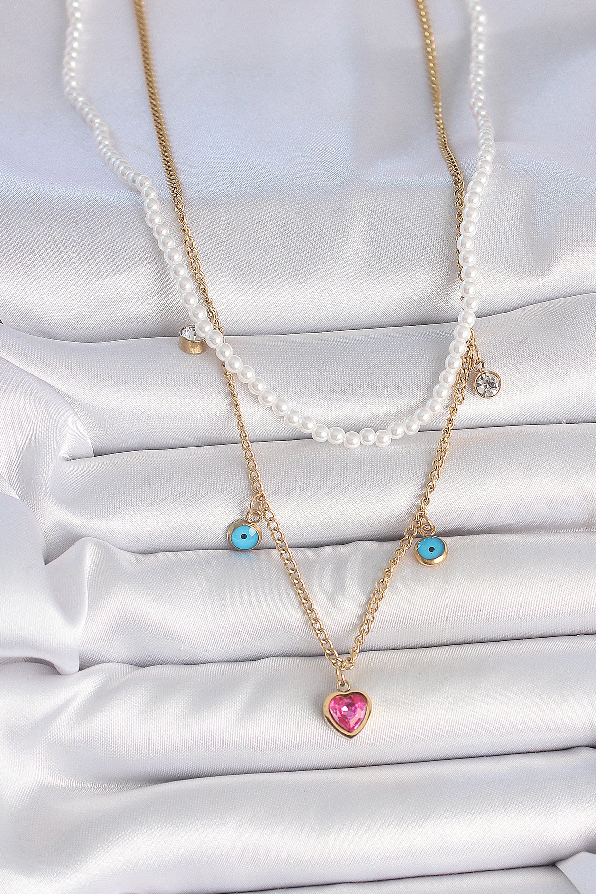 BKO10112 - 316L Çelik Gold Renk 2'Li İnci Zincir Model Pembe Taşlı Kalp Figür Nazar Boncuk Detay Kadın Kolye