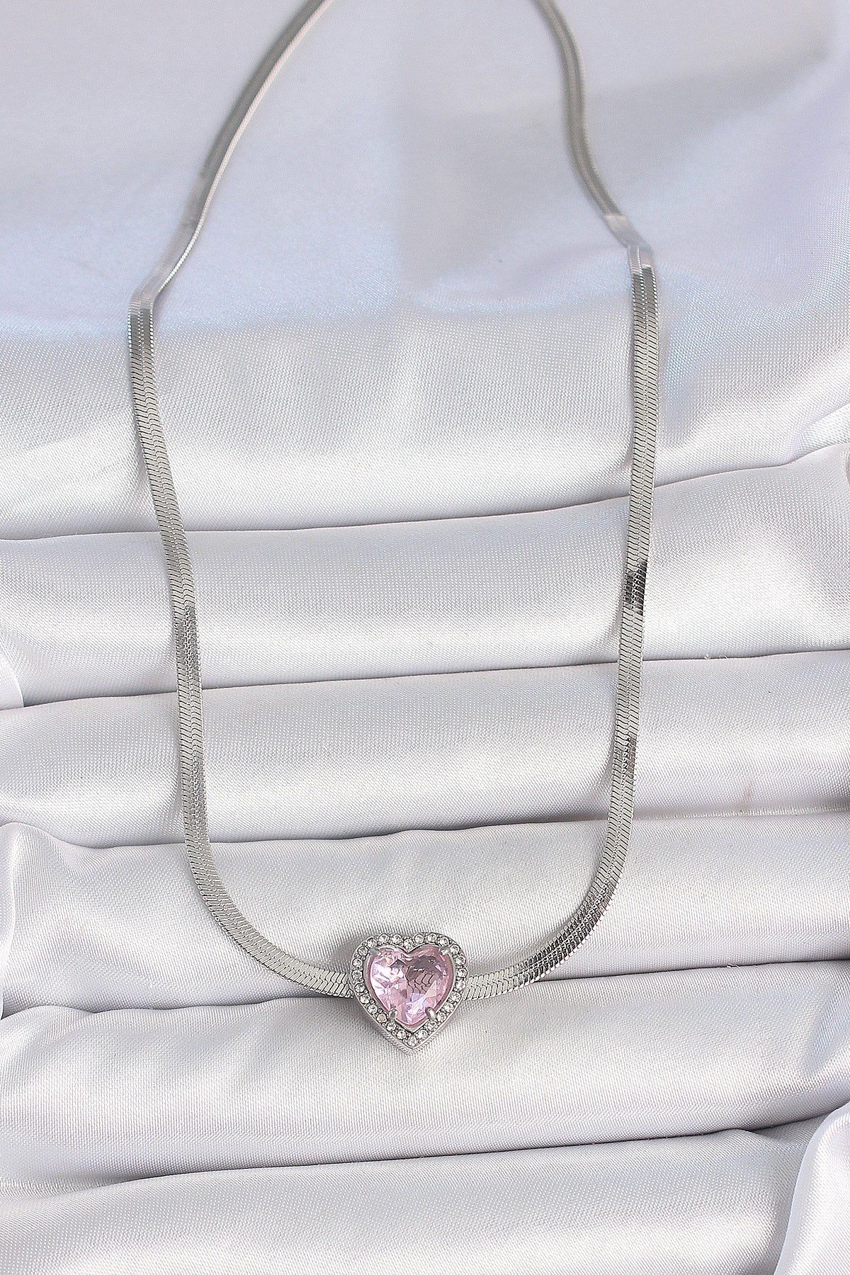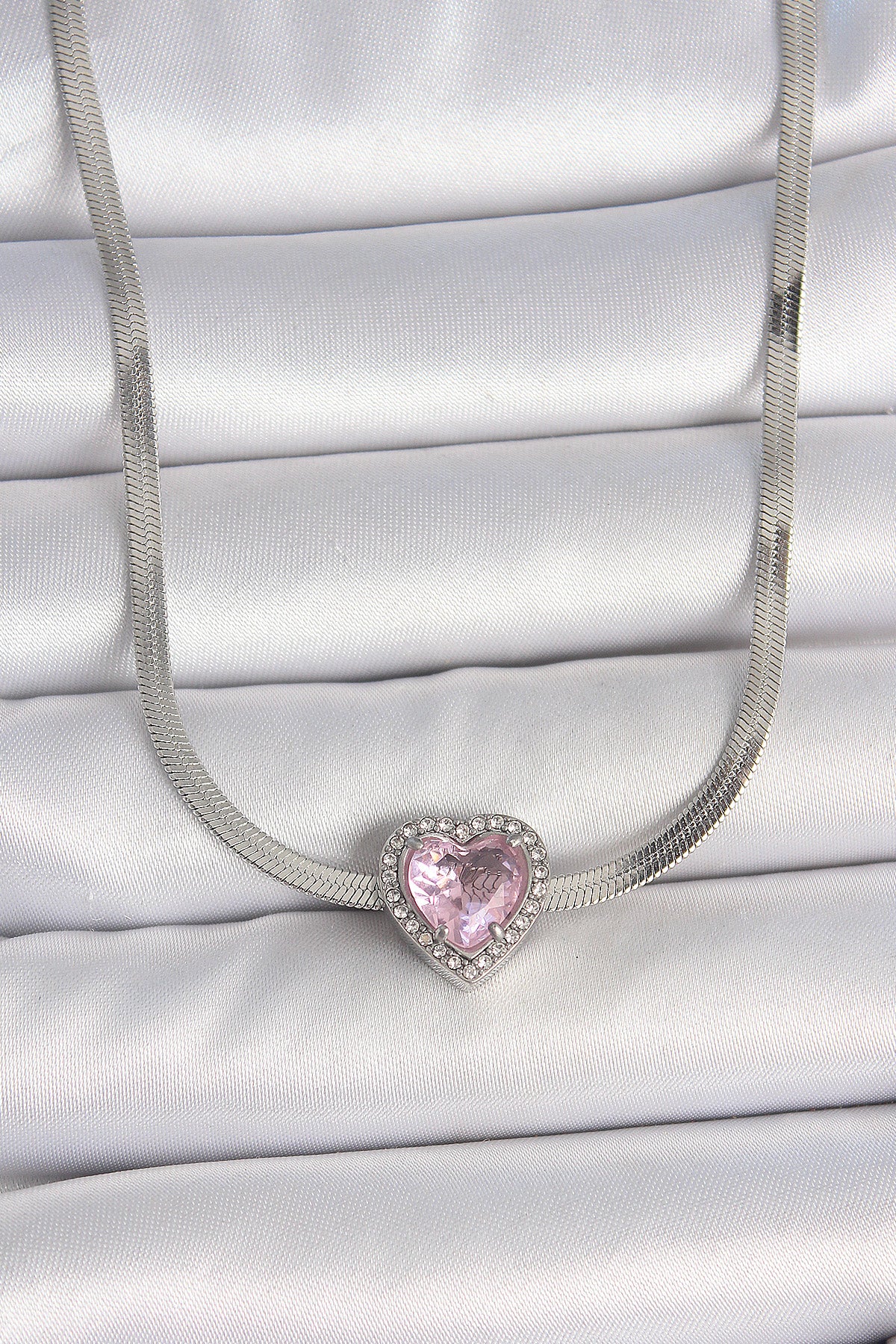 BKO10119 - 316L Çelik Gümüş Renk İtalyan Zincir Pembe Zirkon Taşlı Kalp Model Kadın Kolye