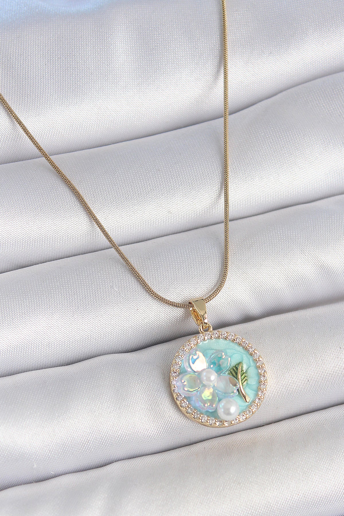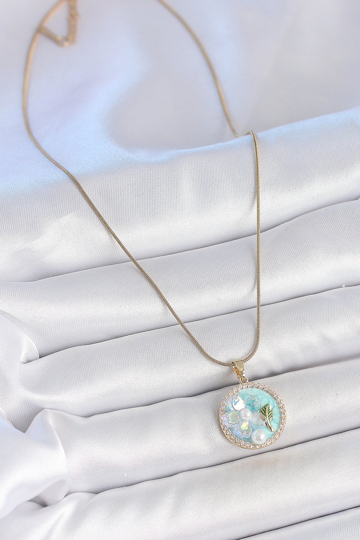 BKO10137 - 316L Çelik Gold Renk Zincir Zirkon Taş Detaylı Mavi Mineli Çiçek İşlemeli İnci Detay Kadın Kolye