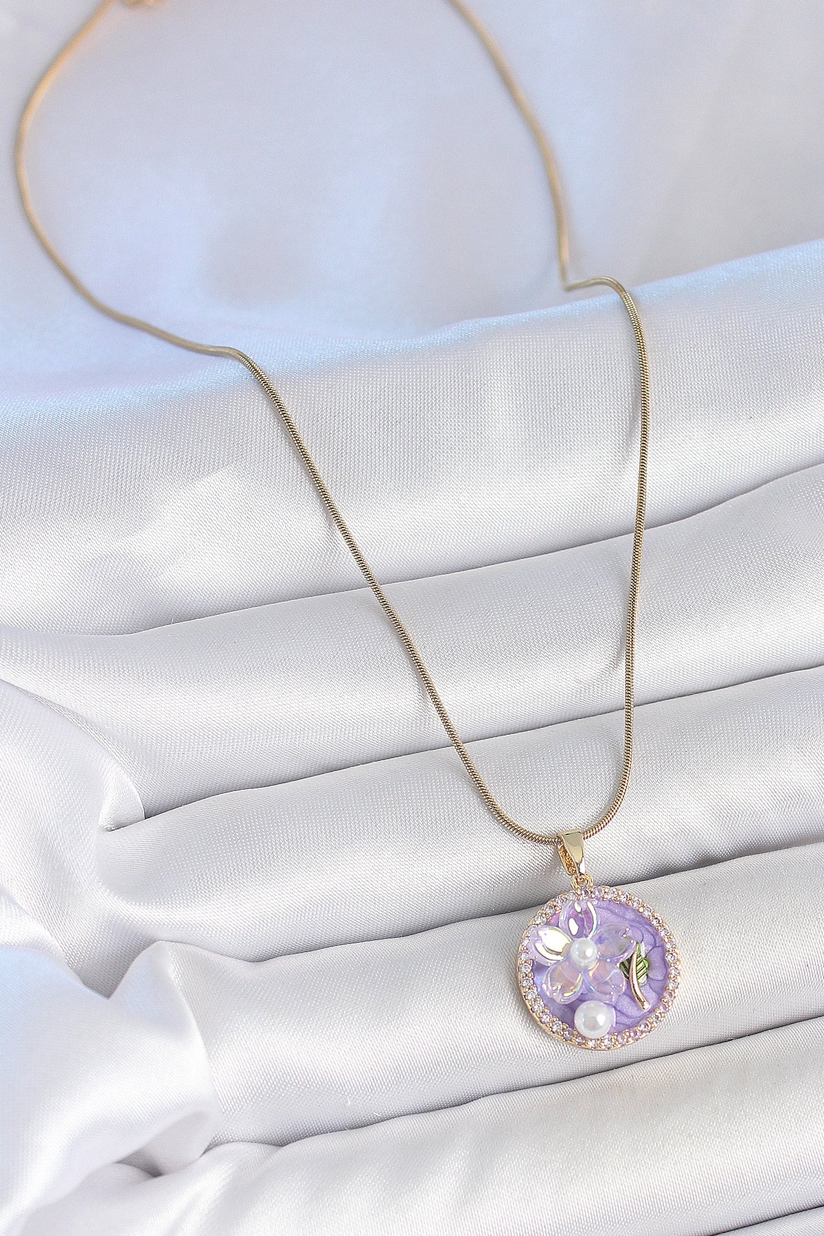 BKO10138 - 316L Çelik Gold Renk Zincir Zirkon Taşlı Mor Mineli Çiçek İşlemeli İnci Detay Portre Model Kadın Kolye