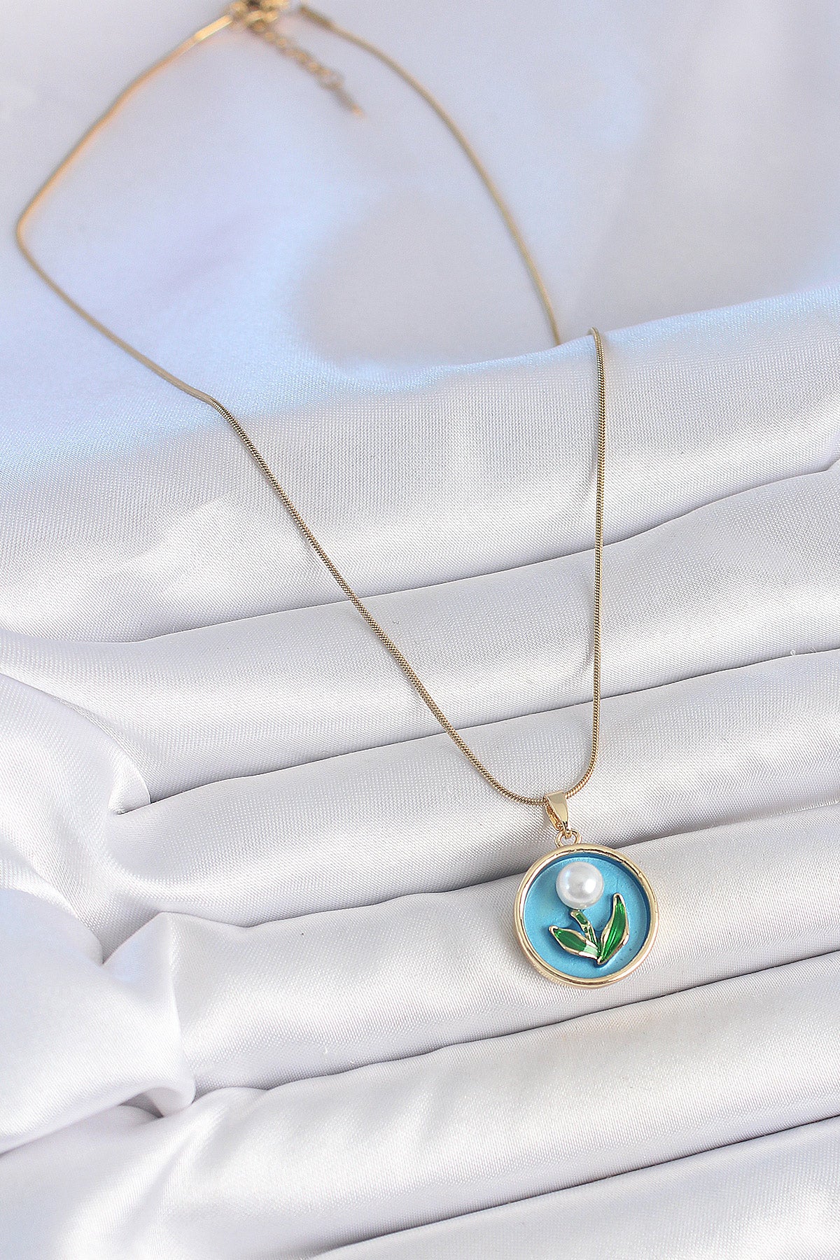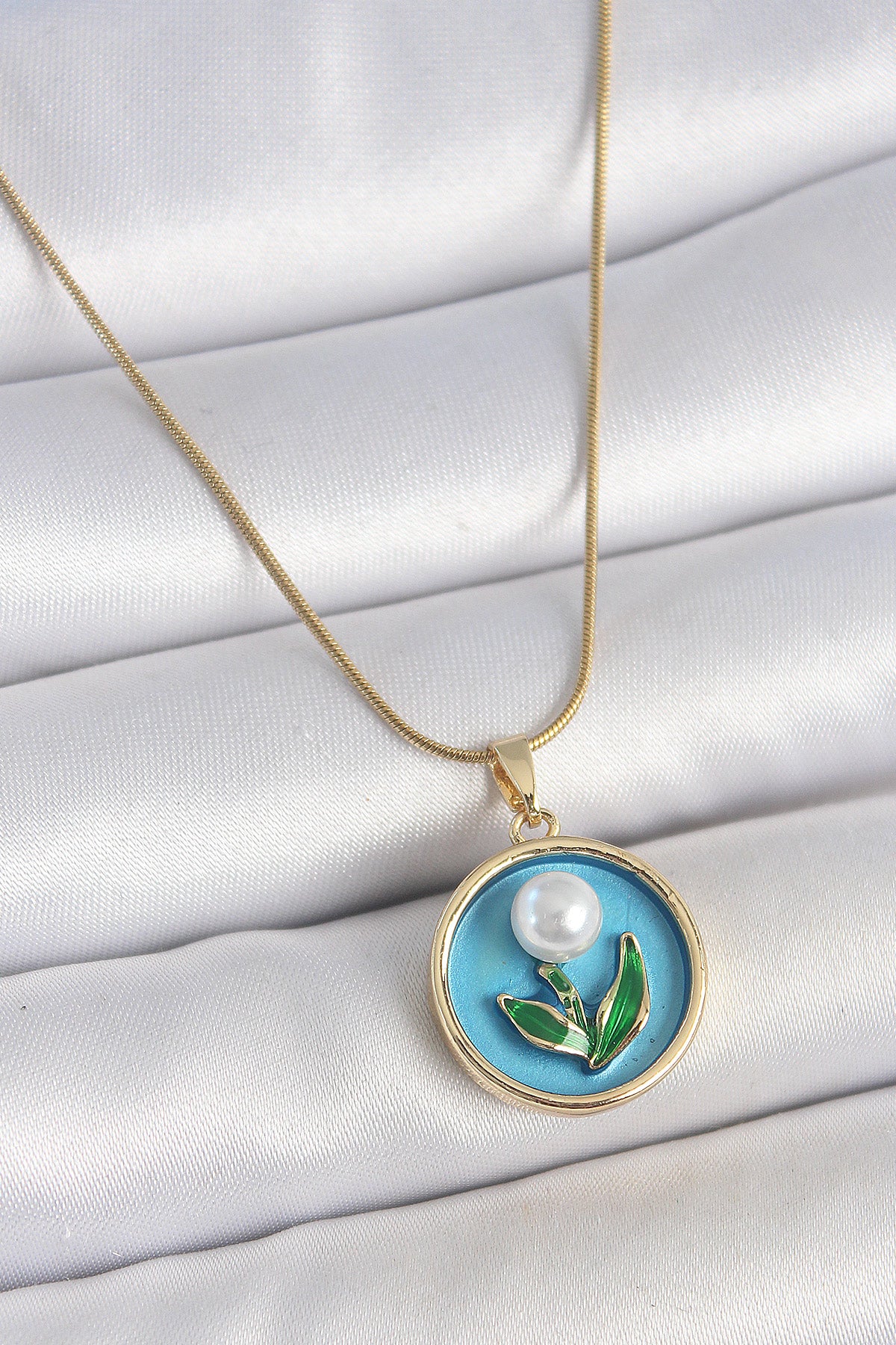 BKO10168 - 316L Çelik Gold Renk Zincir Mavi Mineli İncili Çiçek İşlemeli Portre Model Kadın Kolye