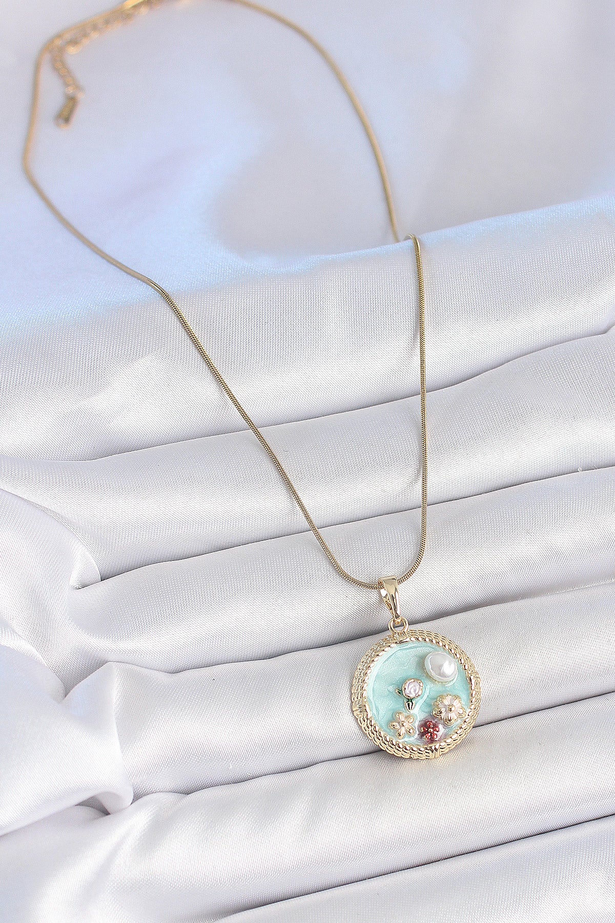 BKO10174 - 316L Çelik Gold Renk Zincir Mavi Mineli İnci Çiçek İşlemeli Zirkon Taş Detaylı Madalyon Model Kadın Kolye