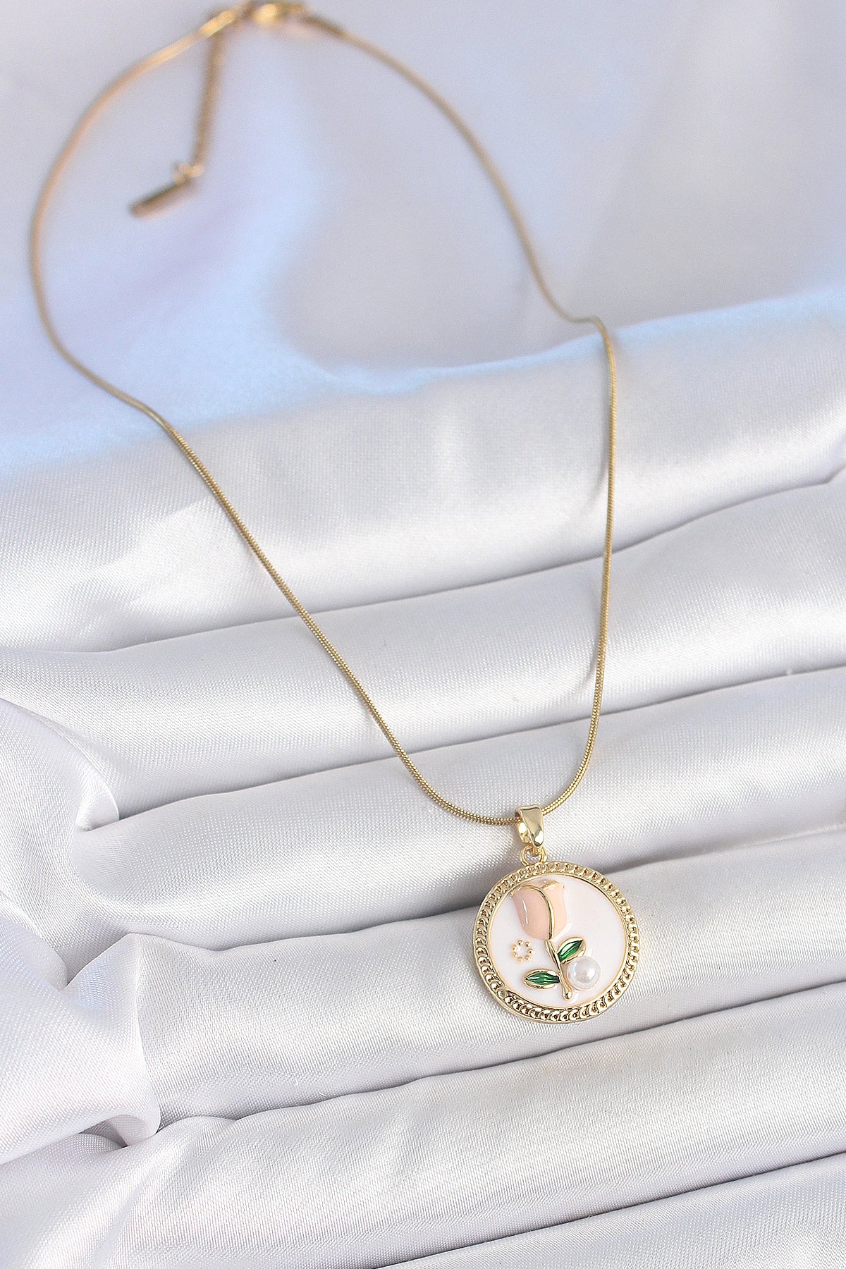 Ürün Adı: | 316L Çelik Gold Renk Beyaz Mineli İncili Çiçek İşlemeli Portre Model Kadın Kolye |