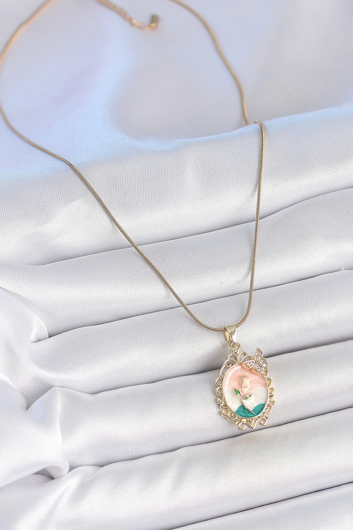 BKO10182 - 316L Çelik Gold Renk Zincir Mix Renk Çiçek İşlemeli Zirkon Taş Detaylı Portre Model Kadın Kolye