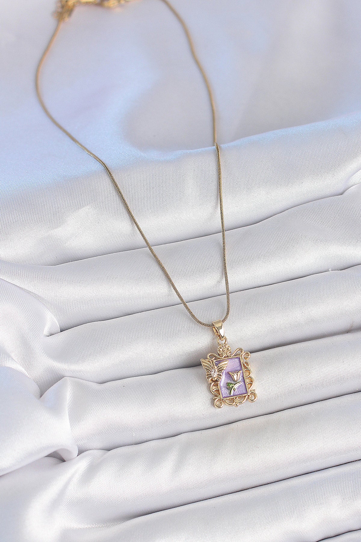 BKO10190 - 316L Çelik Gold Renk Zincir Mor Mineli Çiçek İşlemeli Zirkon Taşlı Kelebek Detay Portre Model Kadın Kolye