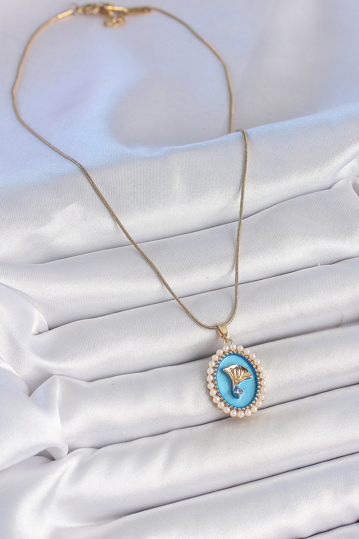 BKO10196 - 316L Çelik Gold Renk Zincir Mavi Mineli İncili Zirkon Taşlı Çiçek İşlemeli Portre Model Kadın Kolye