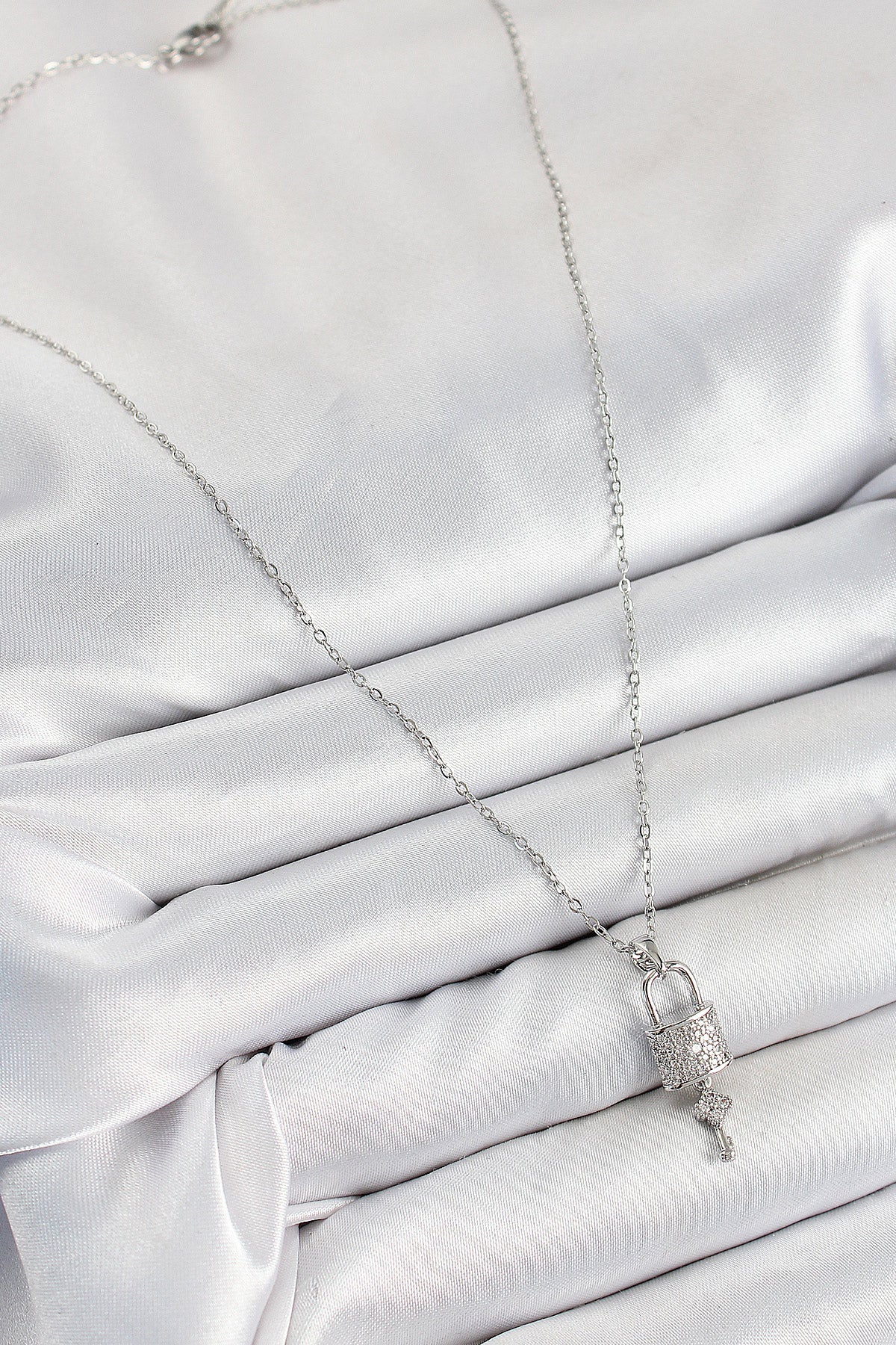 BKO10354 - 316L Çelik Zirkon Taşlı Kilit Ve Sallantılı Anahtar Model Gümüş Renk Kadın Kolye