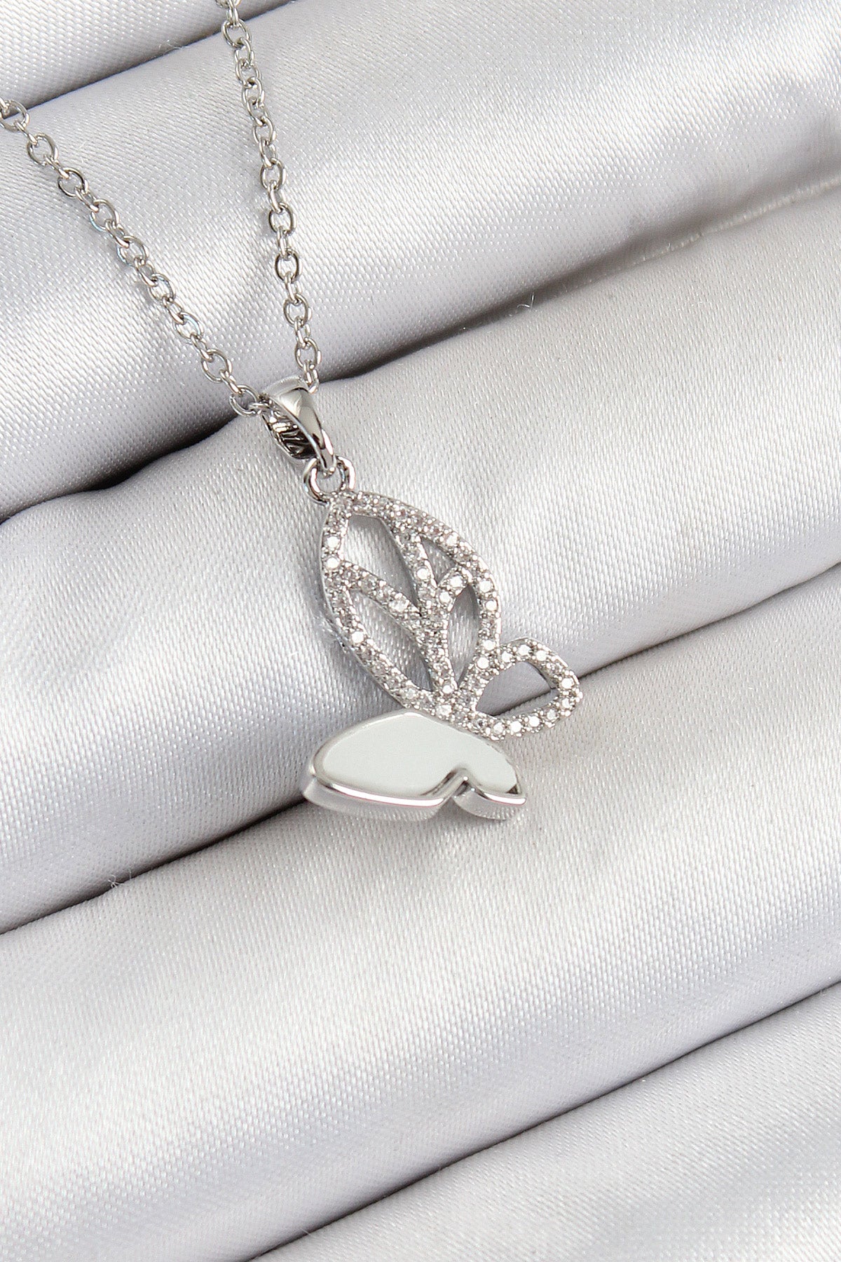 BKO10360 - 316L Çelik Zirkon Taşlı Kelebek Model Gümüş Renk Kadın Kolye