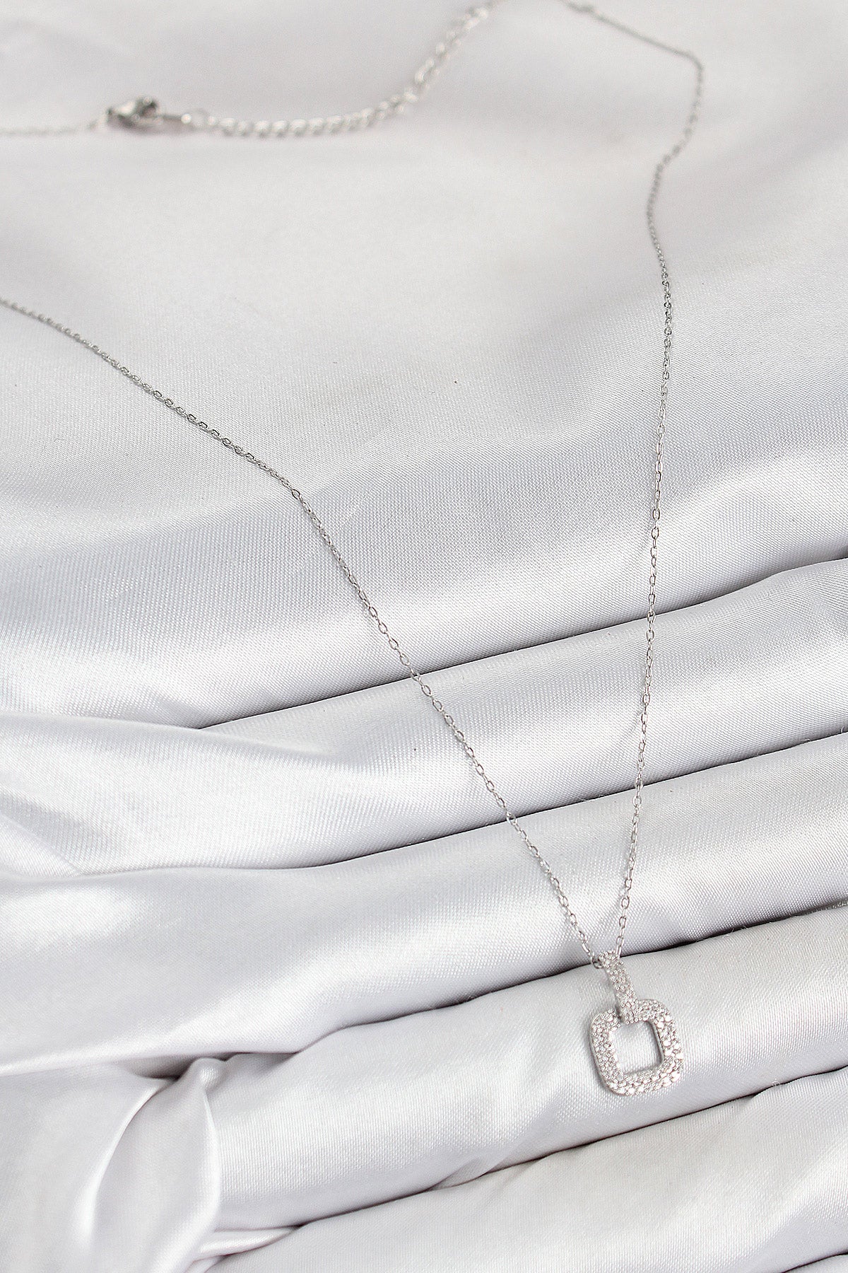 BKO10409 - Pirinç Zirkon Taşlı Kare Model Gümüş Renk Kadın Kolye