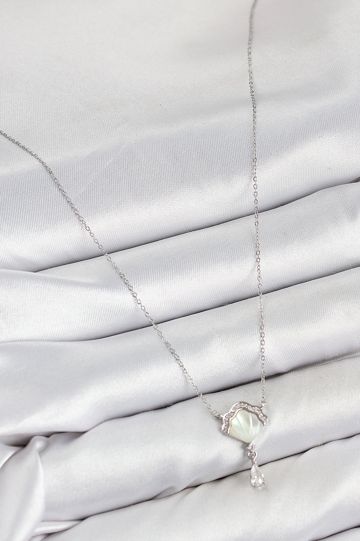 BKO10417 - Pirinç Zirkon Taşlı İstiridye Model Gümüş Renk Kadın Kolye
