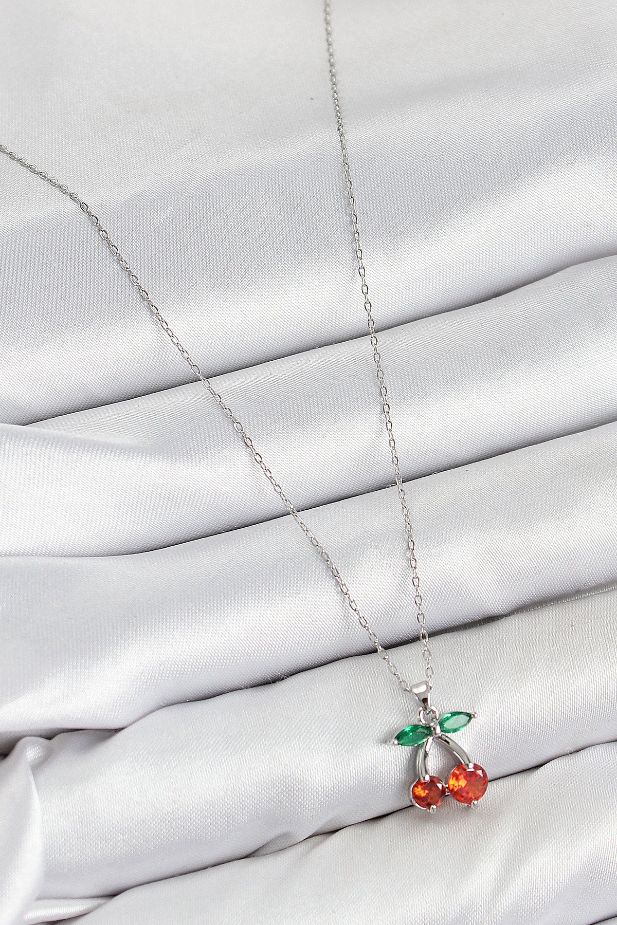BKO10421 - Pirinç Zirkon Taşlı Kiraz Model Gümüş Renk Kadın Kolye