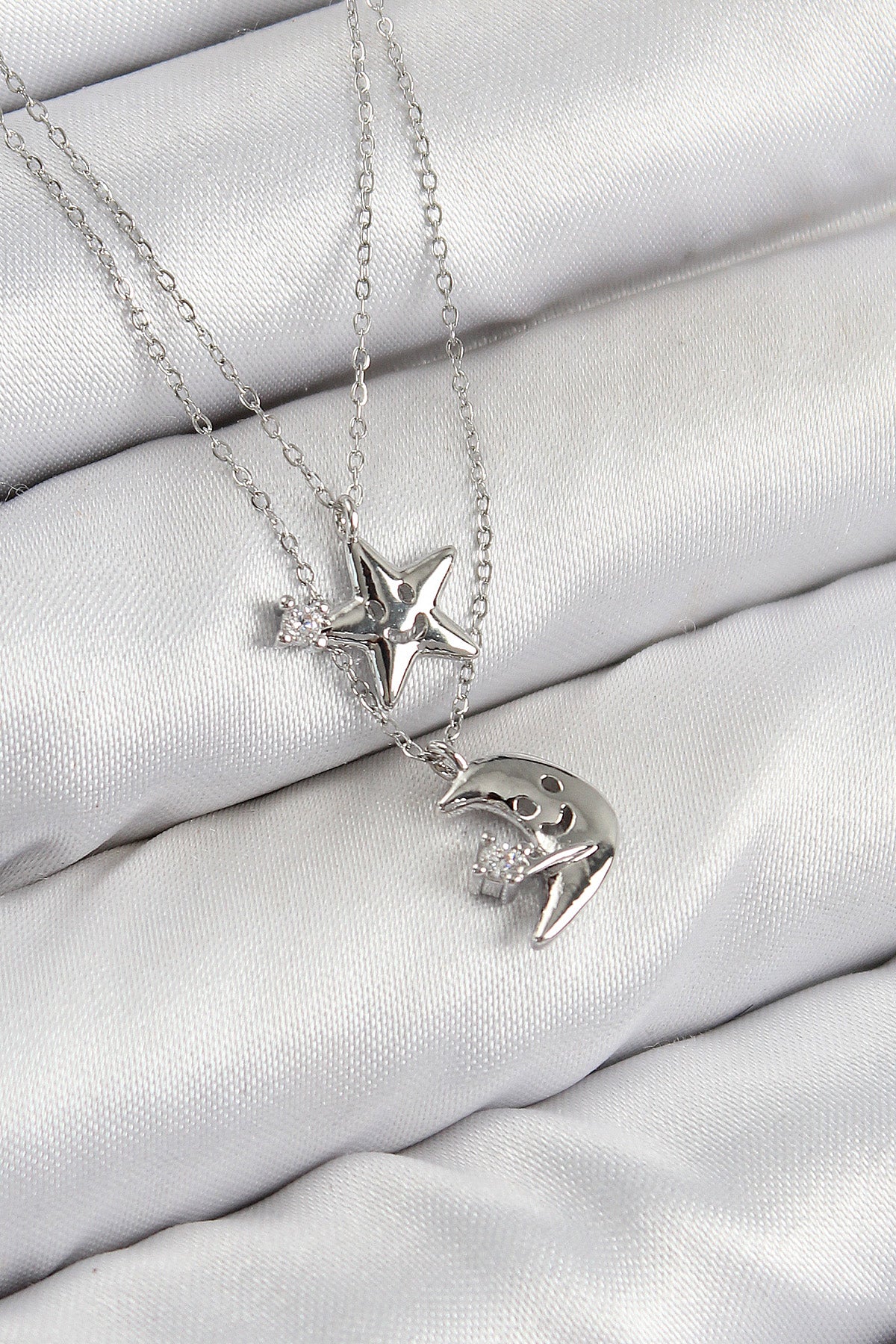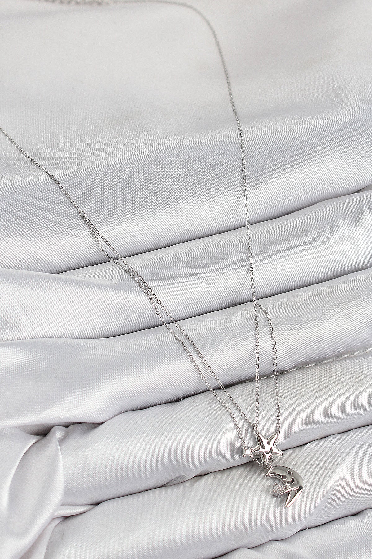 BKO10423 - Pirinç Zirkon Taşlı Yıldız Ve Ay Model Gümüş Renk Kadın Kolye