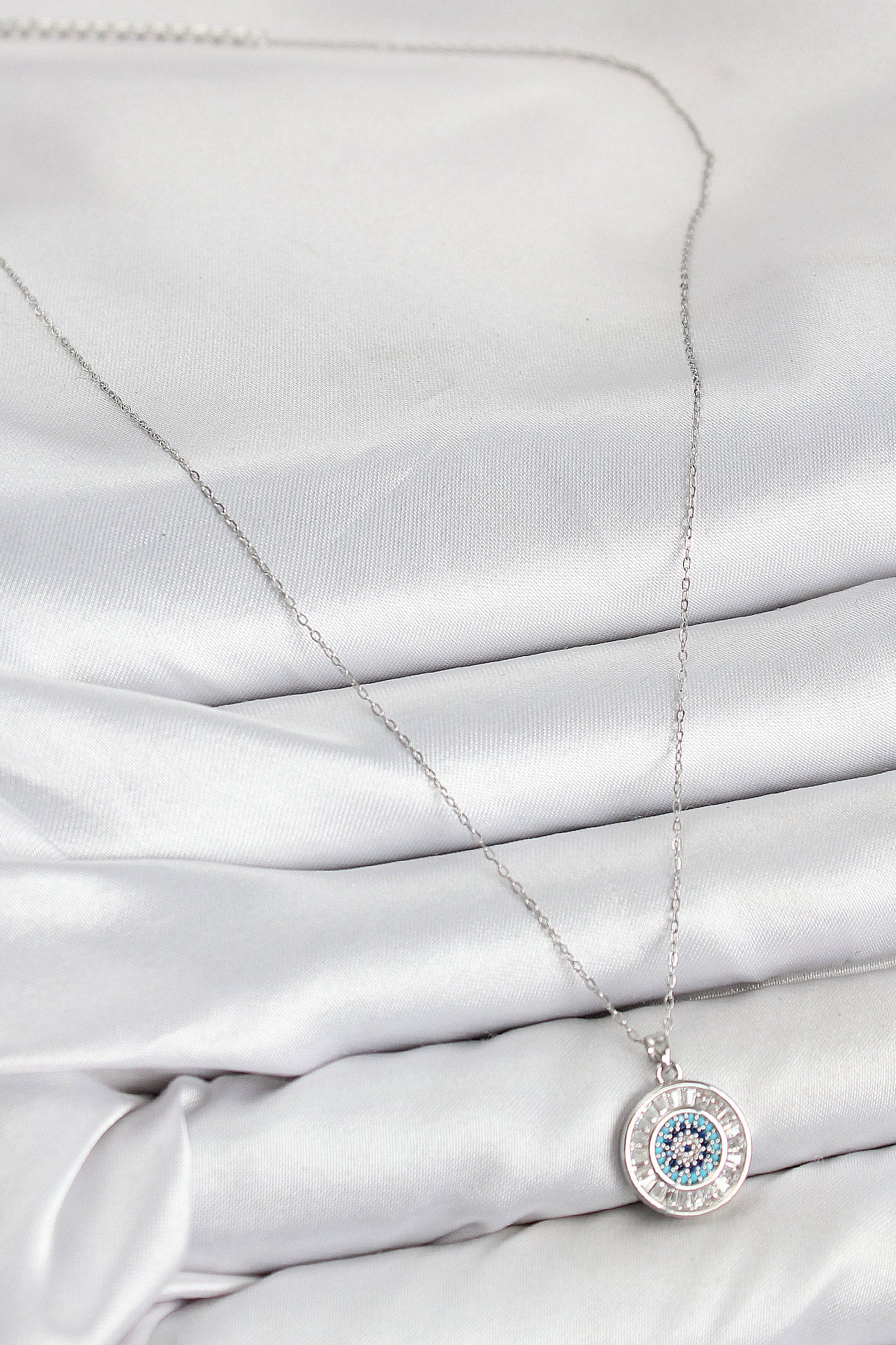 BKO10429 - Pirinç Zirkon Taşlı Su Yolu Nazar Model Gümüş Renk Kadın Kolye