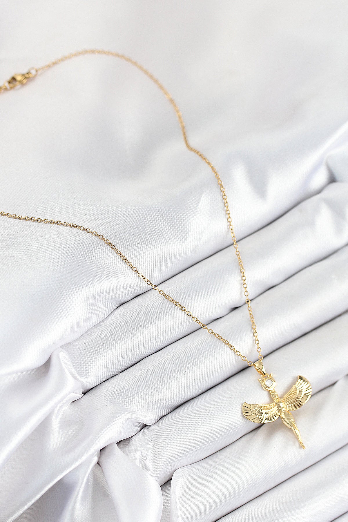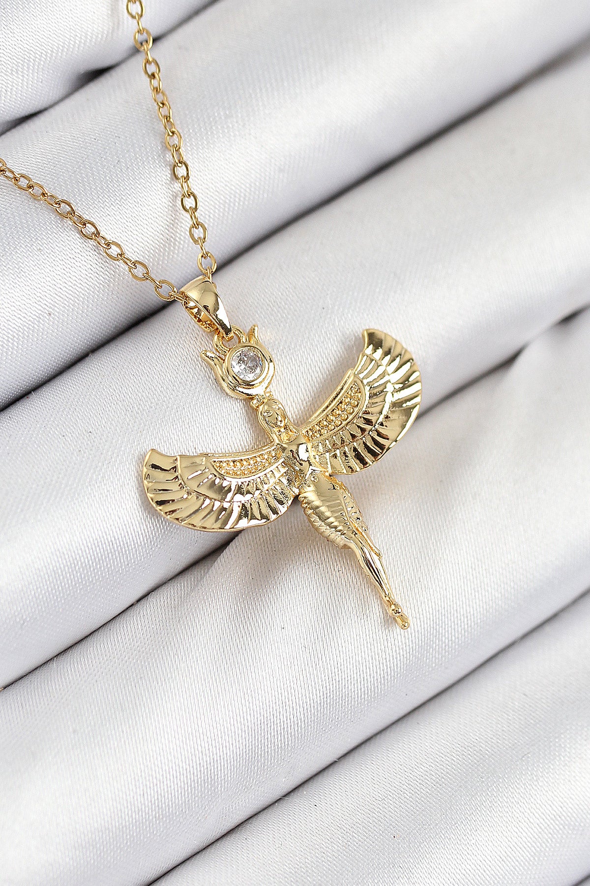 BKO10520 - 316L Çelik Zirkon Taşlı Melek Model Gold Renk Kadın Kolye
