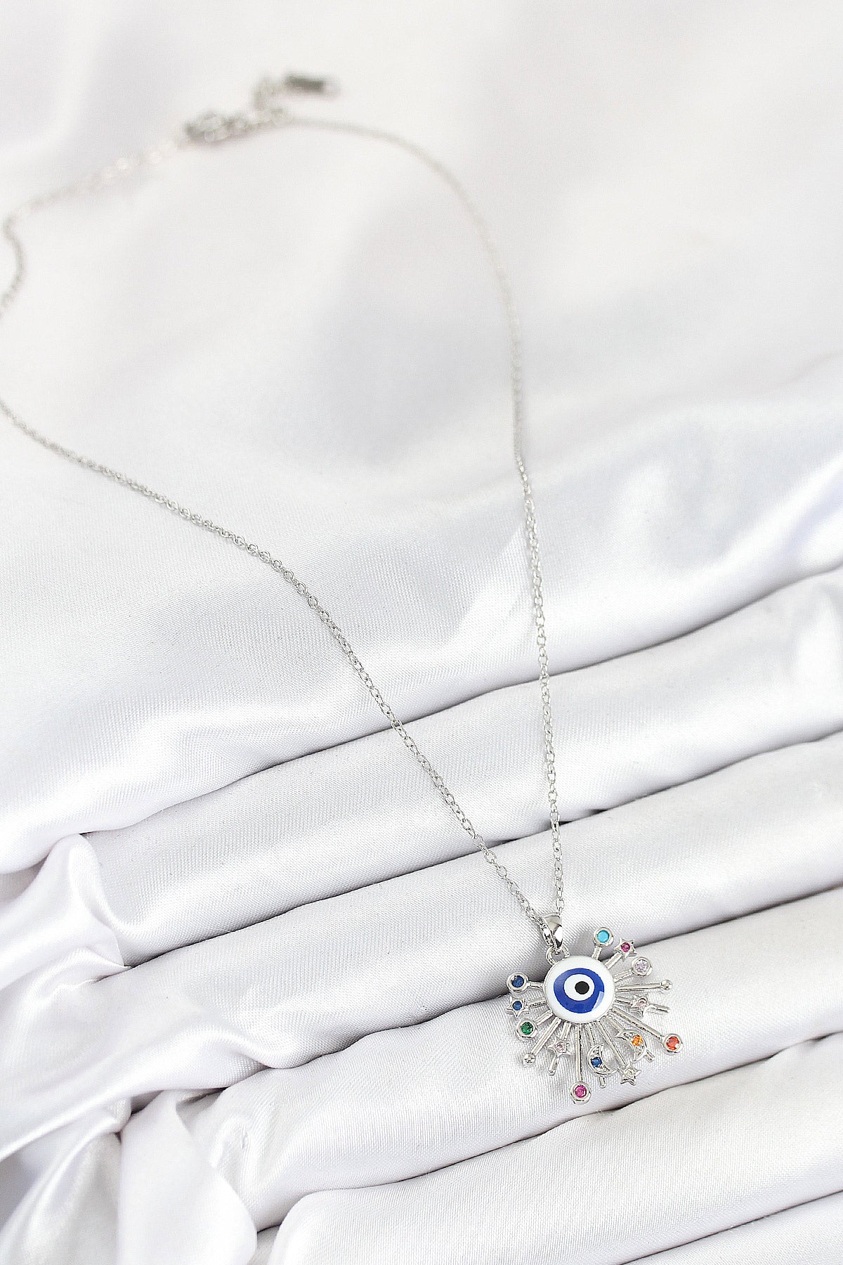 BKO10543 - 316L Çelik Zirkon Taşlı Nazar Model Gümüş Renk Kadın Kolye