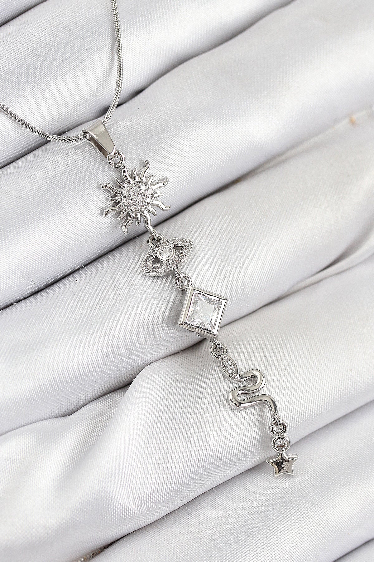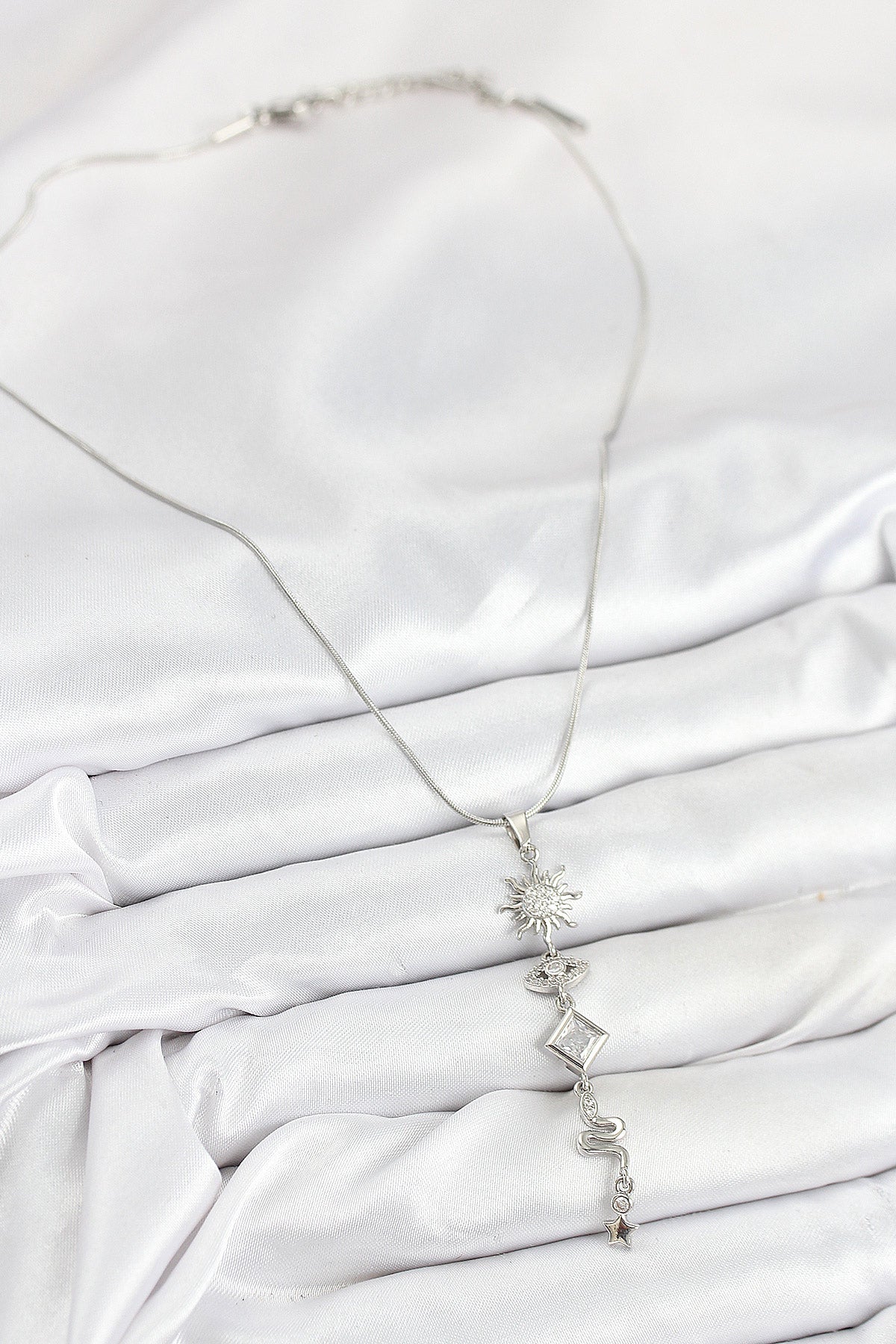 BKO10551 - 316L Çelik Zirkon Taşlı Güneş Ve Ay Enerji Model Gümüş Renk Kadın Kolye