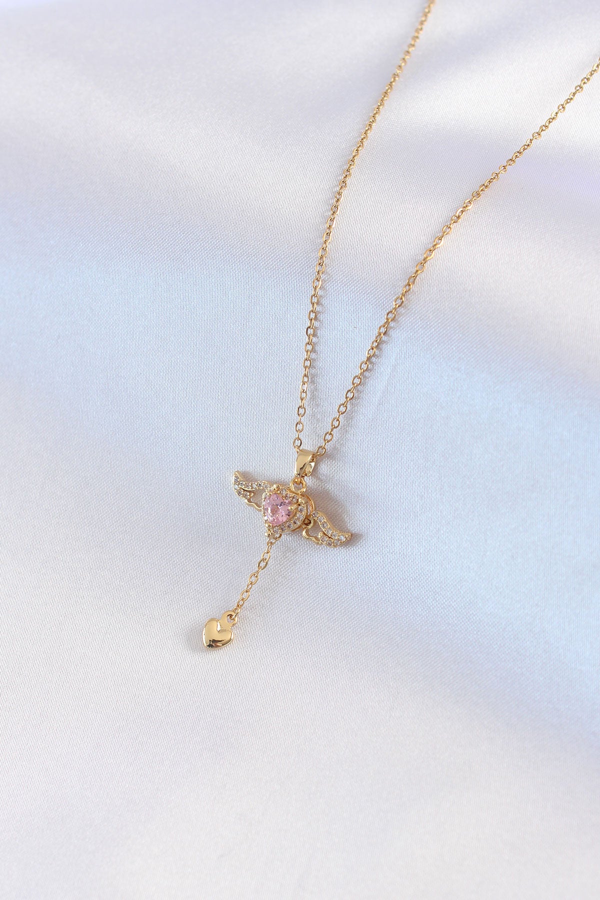 BKO7411 - 316L Çelik Gold Renk Kanatlı Kalp Model Zirkon Taş Detay Kadın Kolye