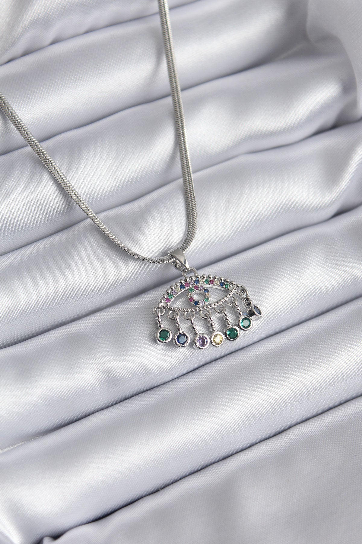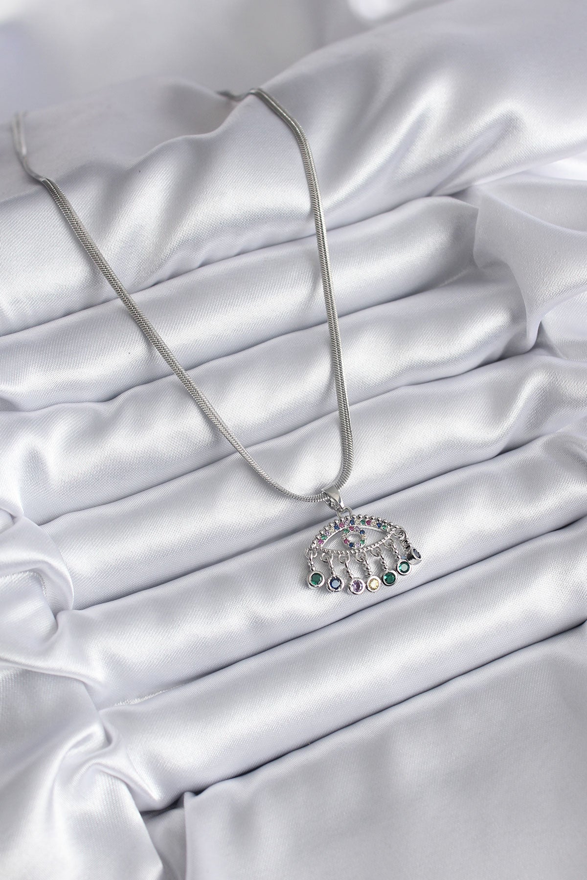 BKO8146 - 316L Çelik Gümüş Renk İtalyan Zincir Zirkon Taşlı Göz Figür Kadın Kolye