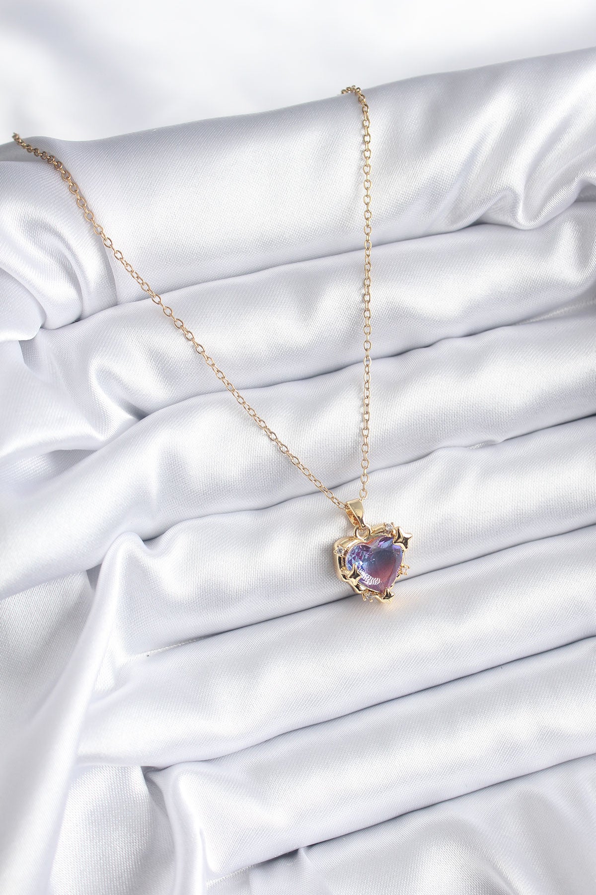 - Ürün Adı: 316L Çelik Zincir Gold Renk Mor Renk Zirkon Taşlı Kalp Model Kadın Kolye