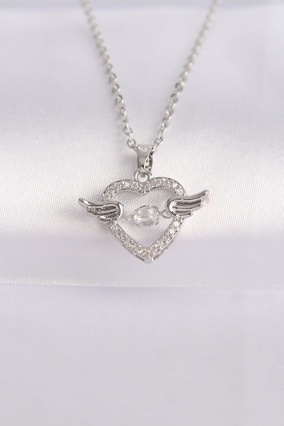 BKO8627 - 316L Çelik Zincir Gümüş Renk Zirkon Taşlı Kanatlı Kalp Kolye