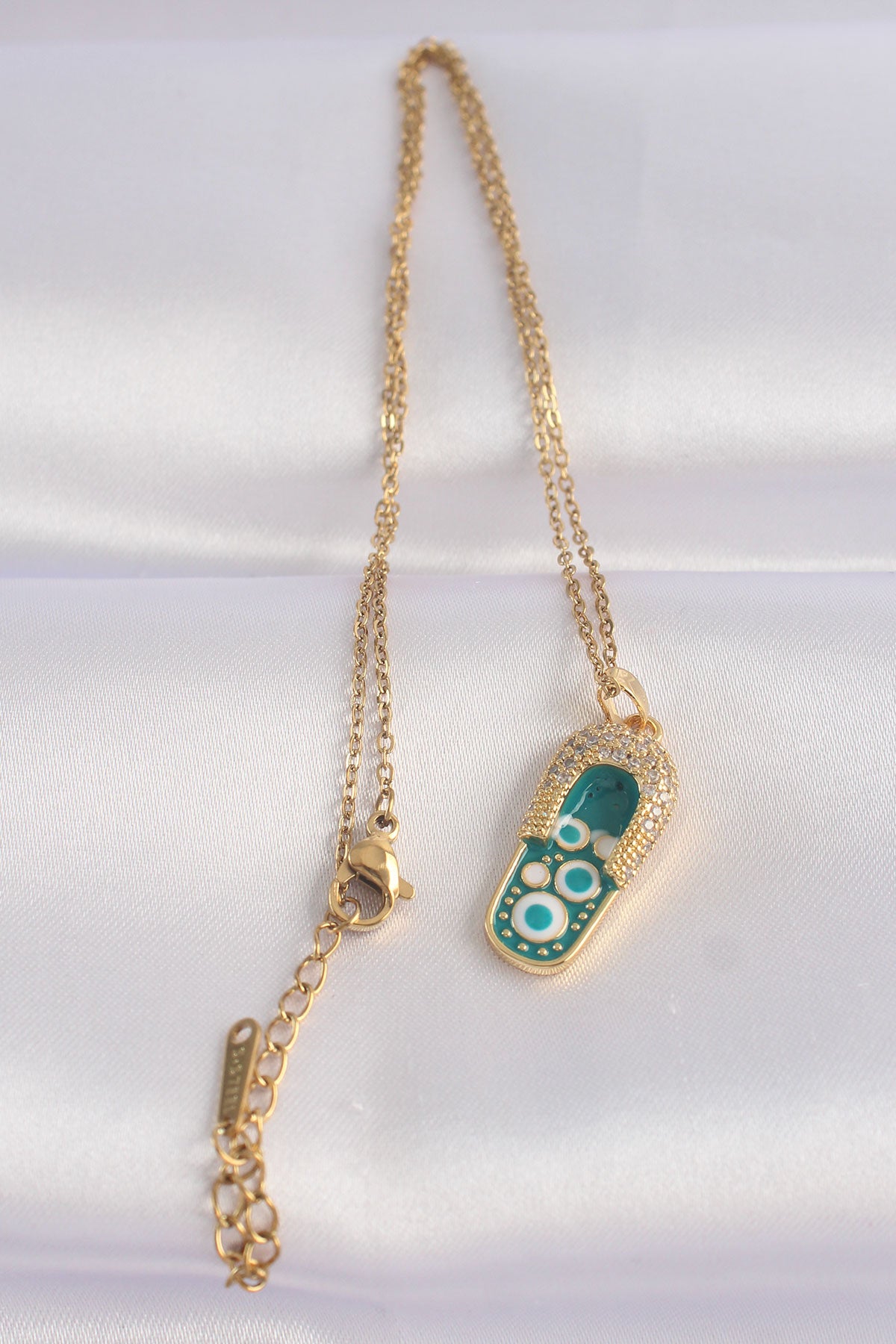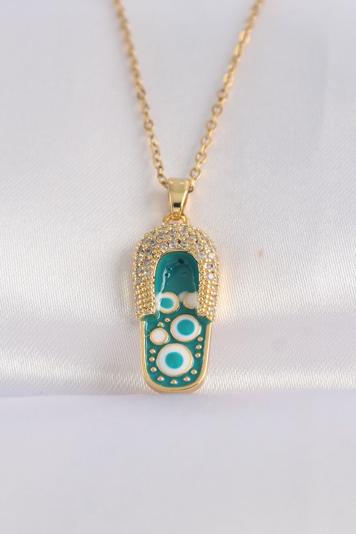 BKO8664 - 316L Çelik Zincir Zirkon Taşlı Altın Renk Nazarlı Terlik Tasarımlı Kolye