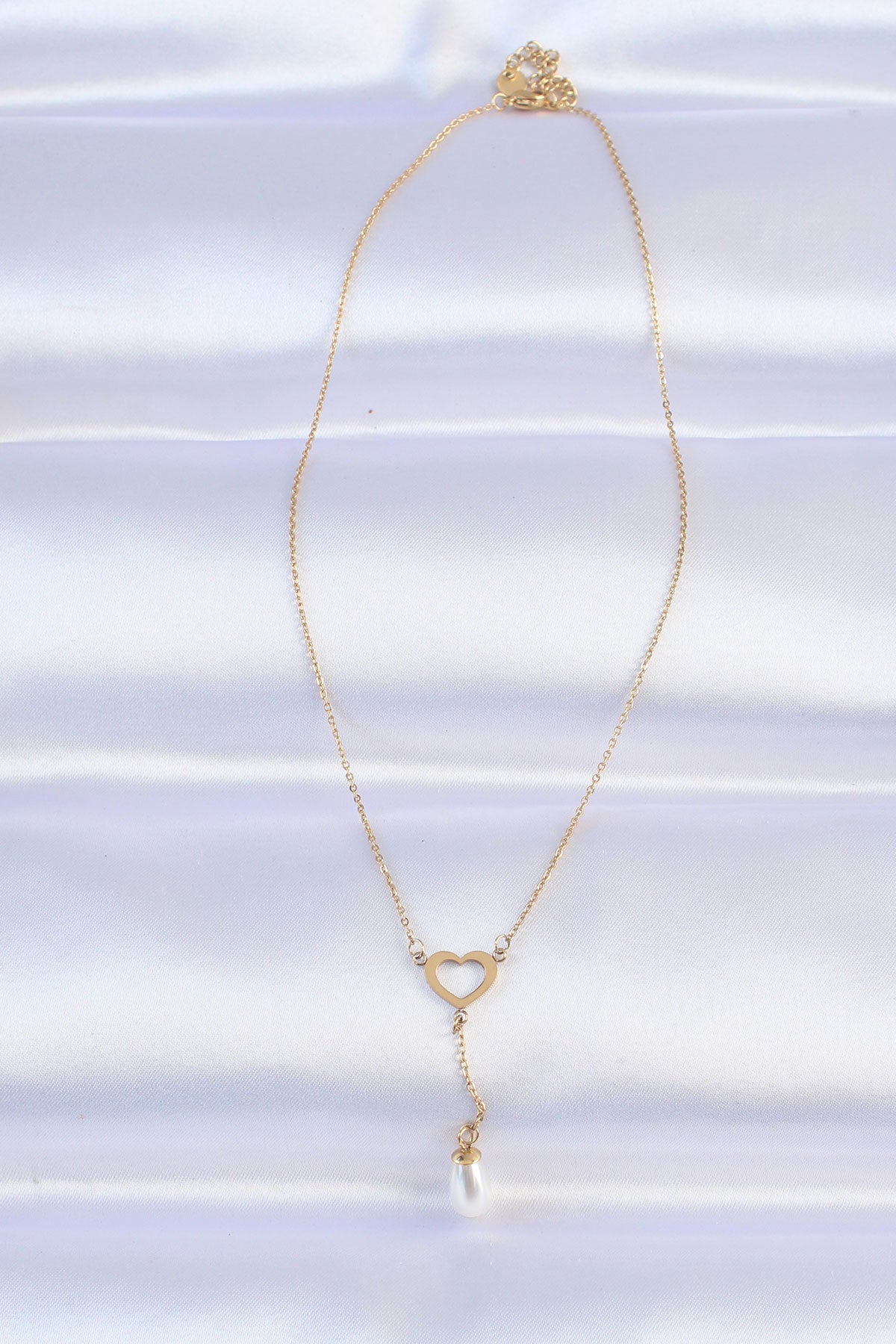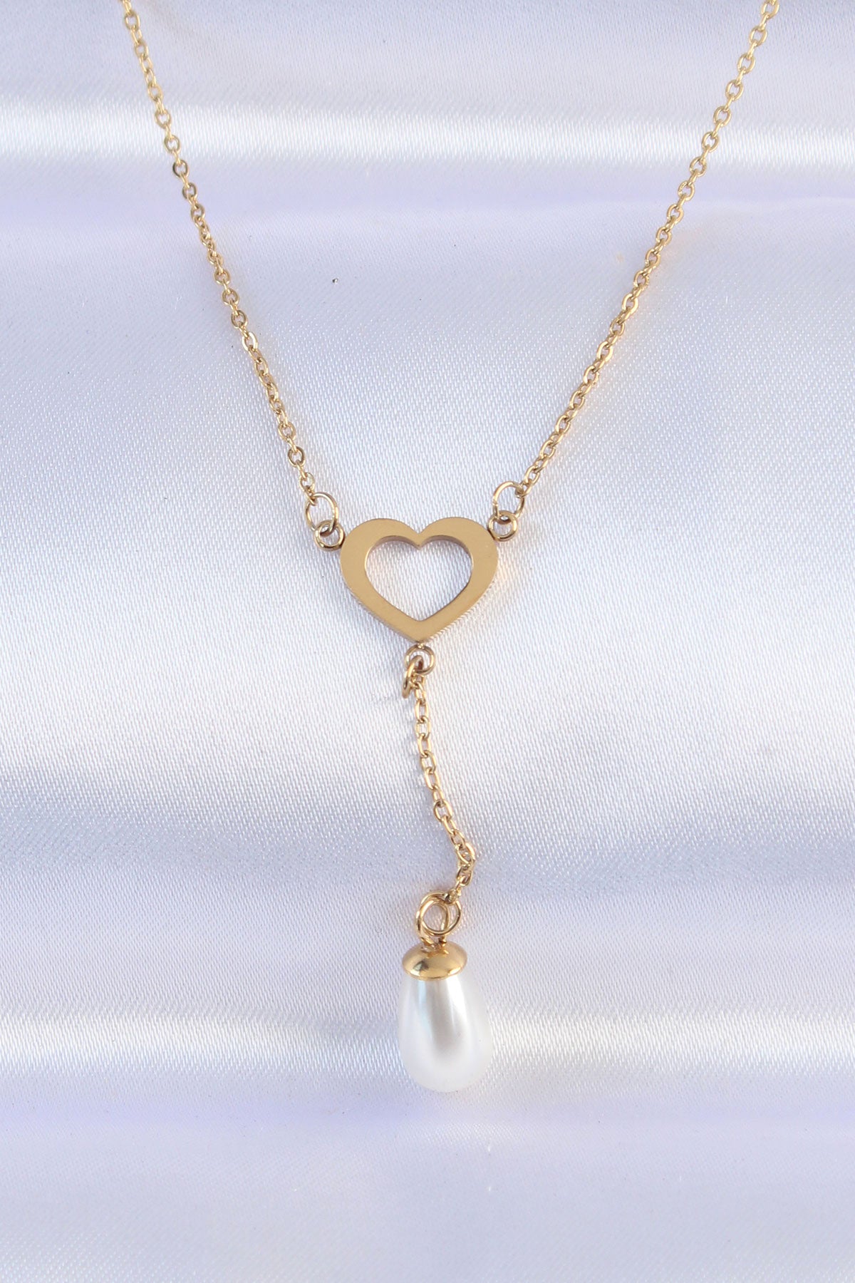 316L Çelik Zincir Gold Renk İnci Taş Detay Kalp Kolye |