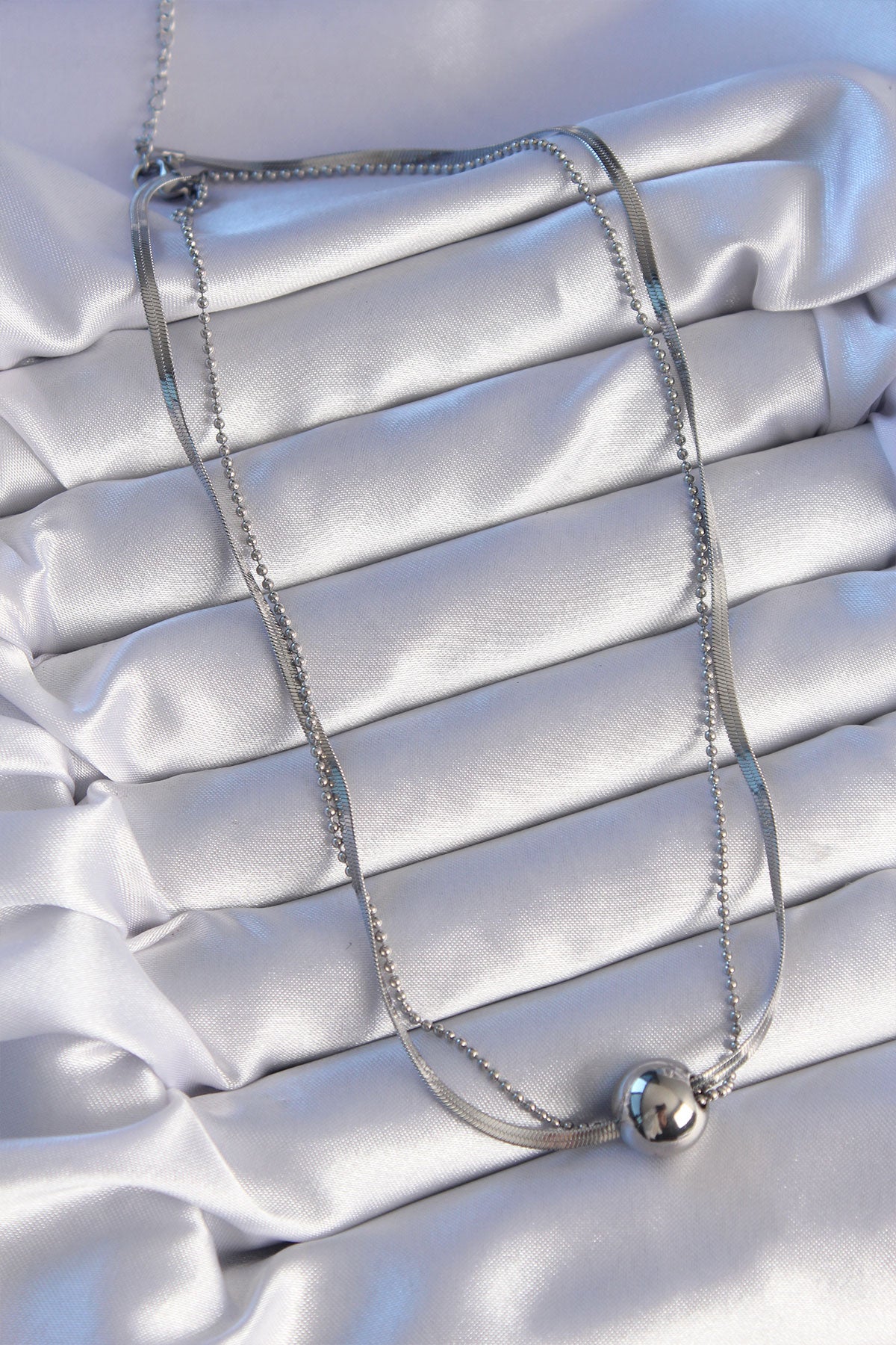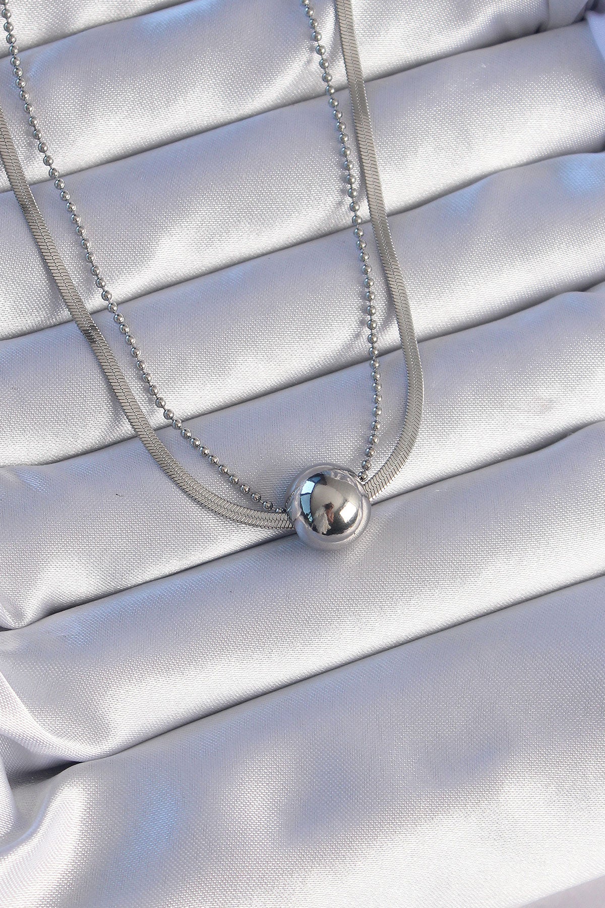BKO8877 - 316L Çelik Çift Zincirli Gümüş Renk Topçuk İtalyan Model Kolye