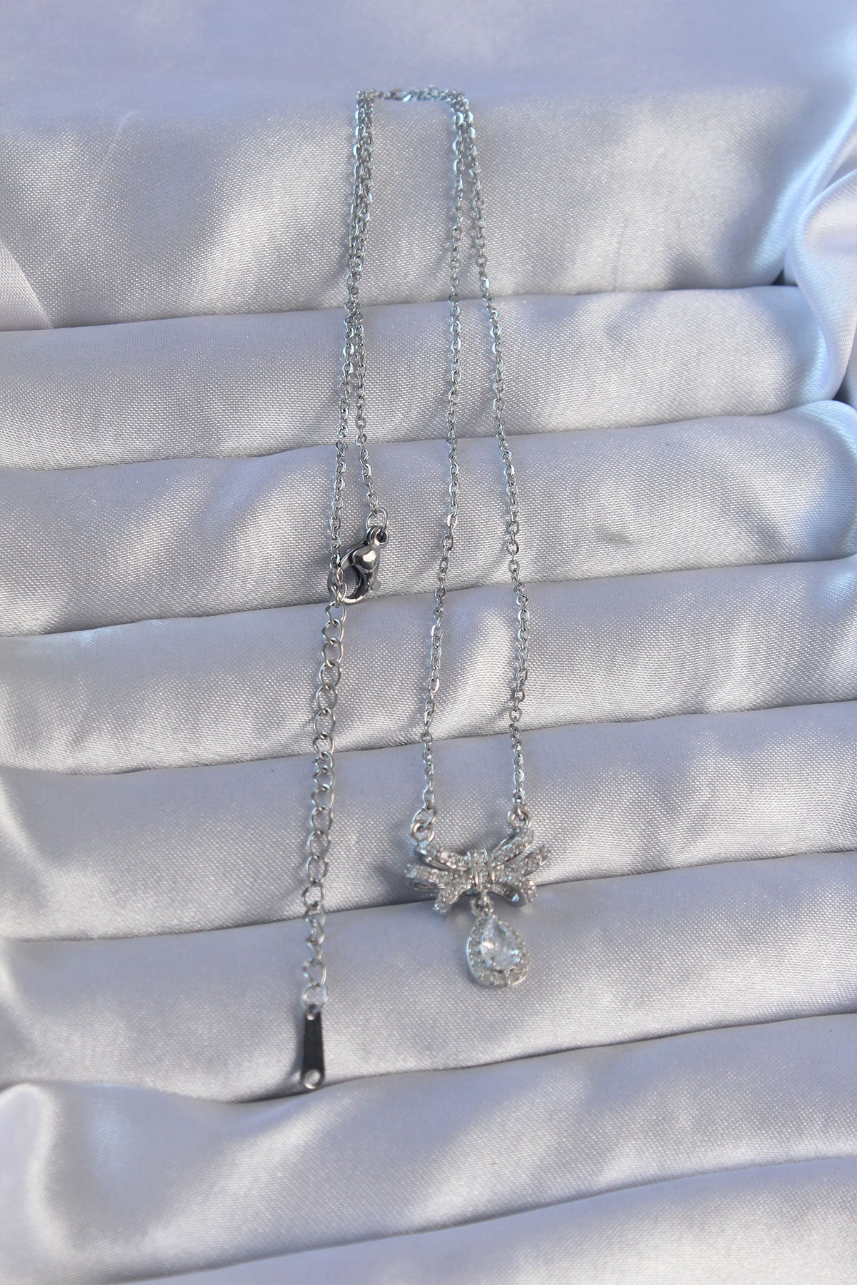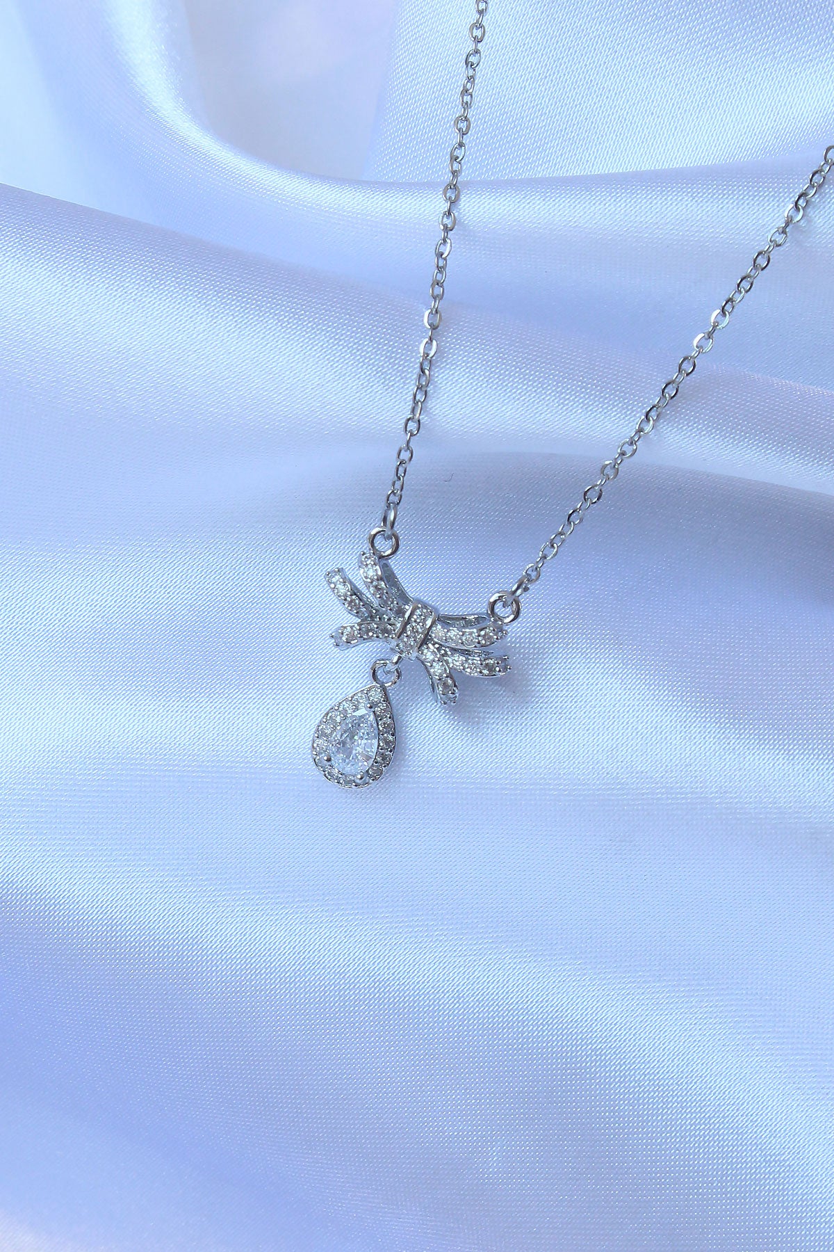 BKO8897 - 316L Çelik Zincirli Gümüş Renk Zirkon Taşlı Damla Detay Fiyonk Model Kolye