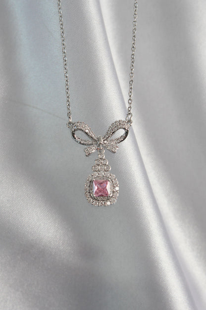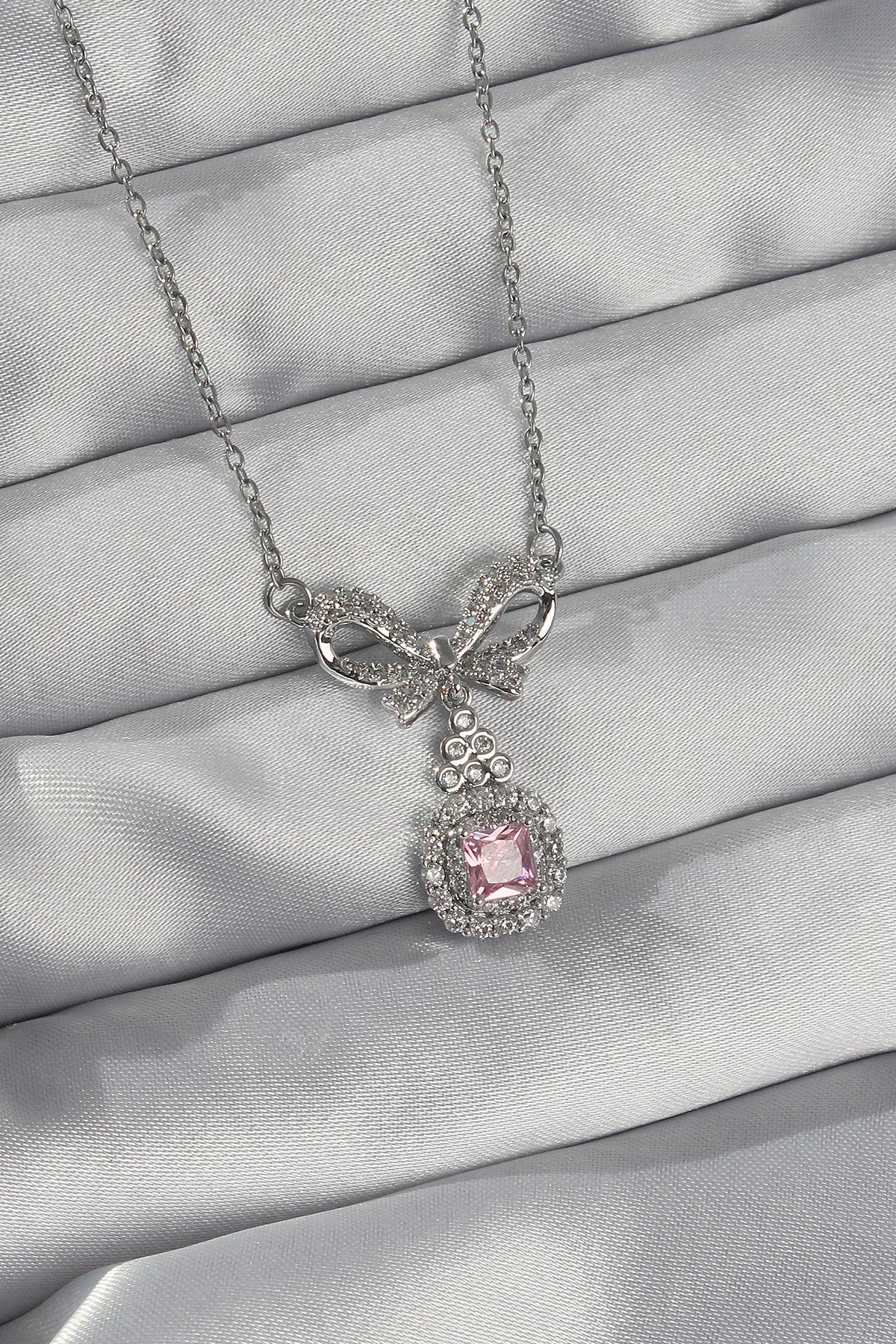 - Ürün Adı: 316L Çelik Gümüş Renk Fiyonk Detay Pembe Zirkon Taşlı Tektaş Kolye