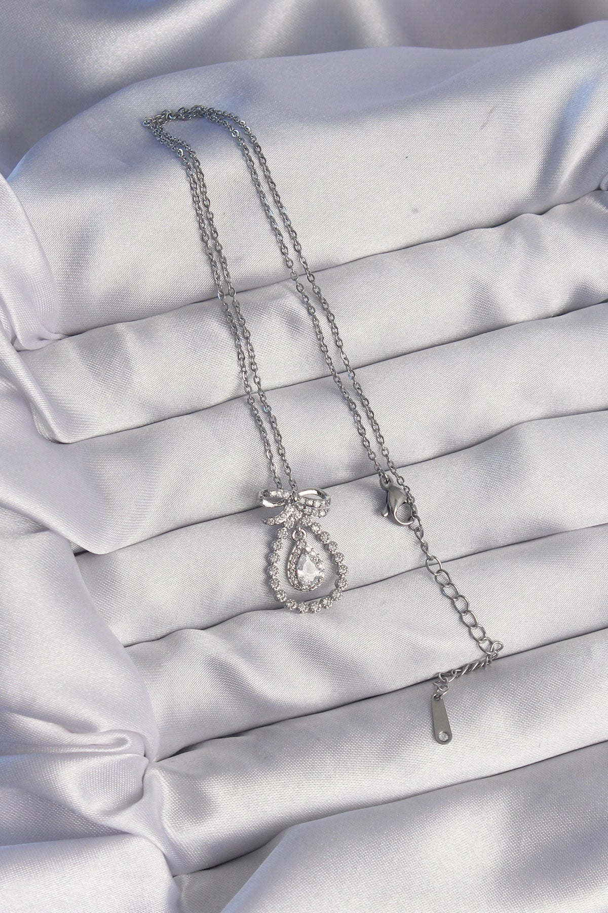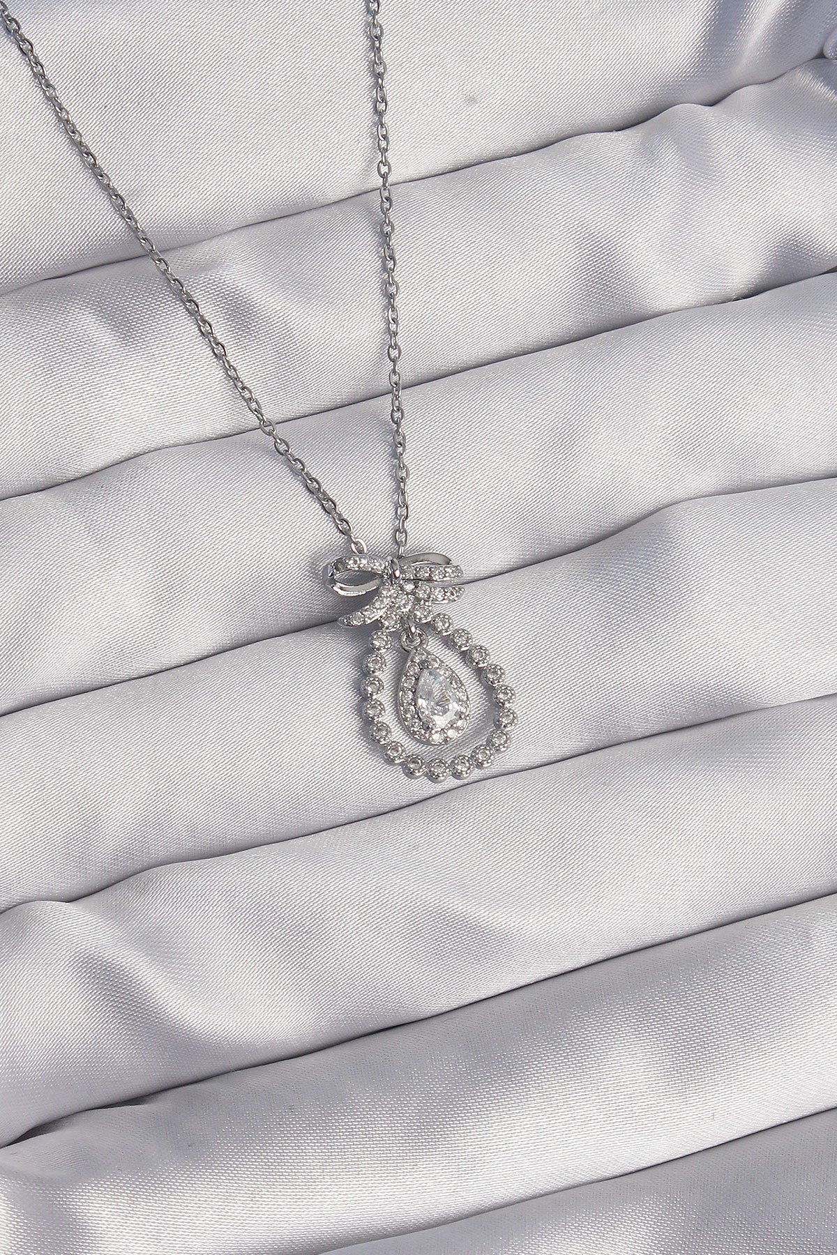 BKO8930 - 316L Çelik Gümüş Renk Fiyonk Detaylı Zirkon Taşlı Damla Model Kolye