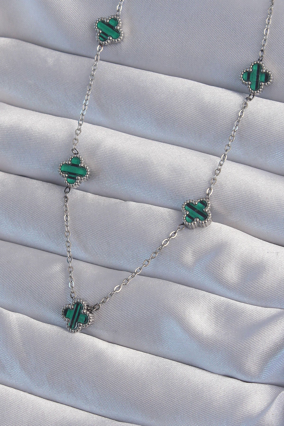 316L Çelik Gümüş Renk Minimal Yeşil Mineli Yonca Kolye |