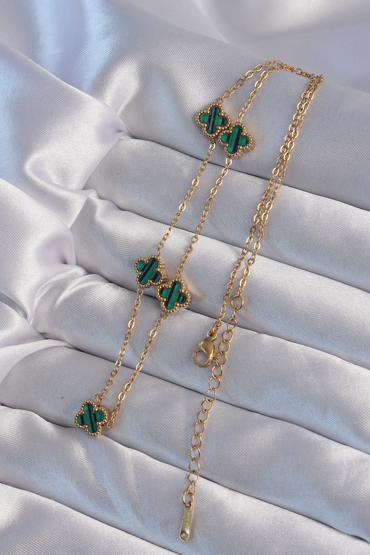 316L Çelik Gold Renk Minimal Yeşil Mineli Yonca Kolye |
