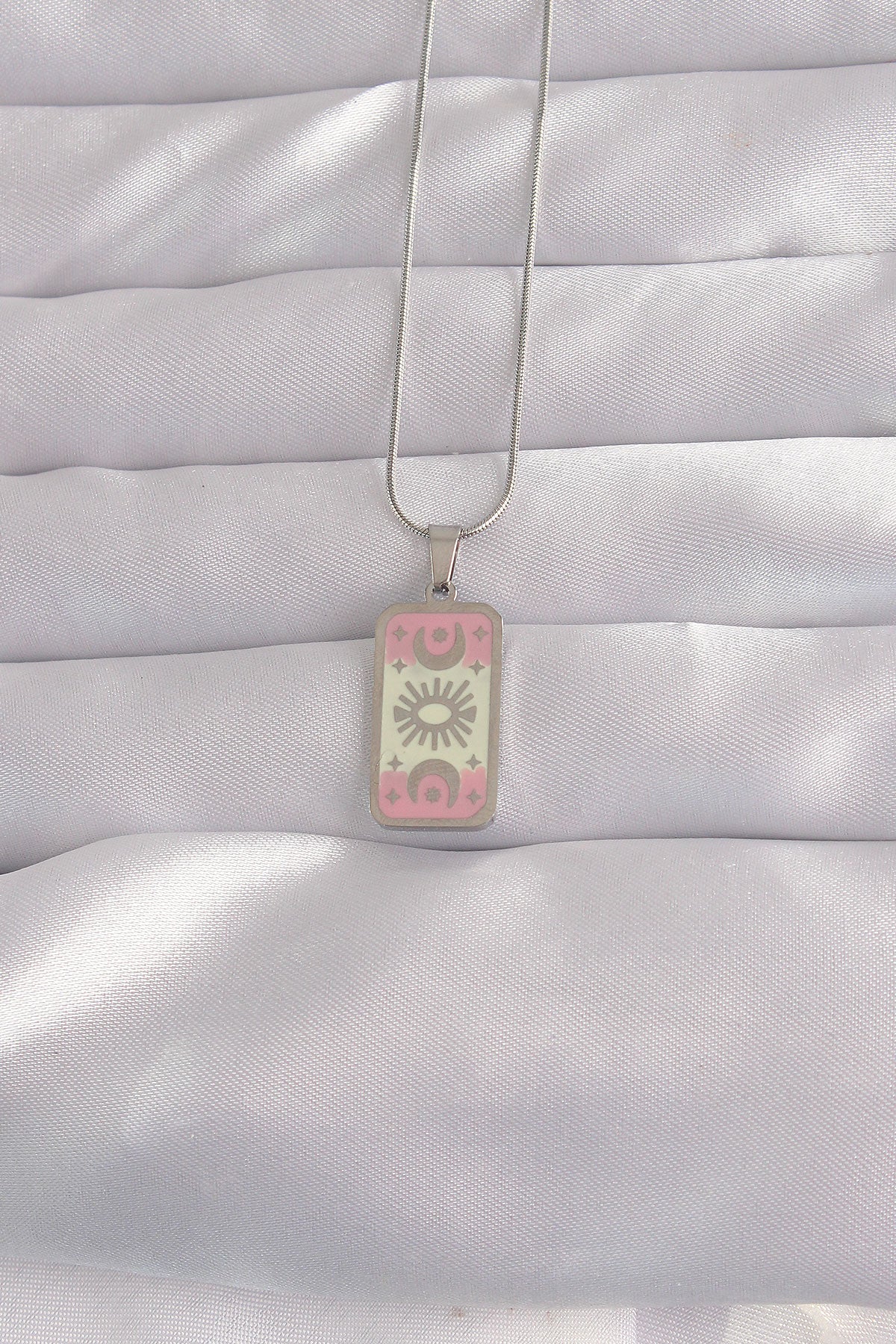 - Ürün Adı: 316L Çelik Gümüş Renk Pembe Mineli Ay Figür Tarot Kolye
