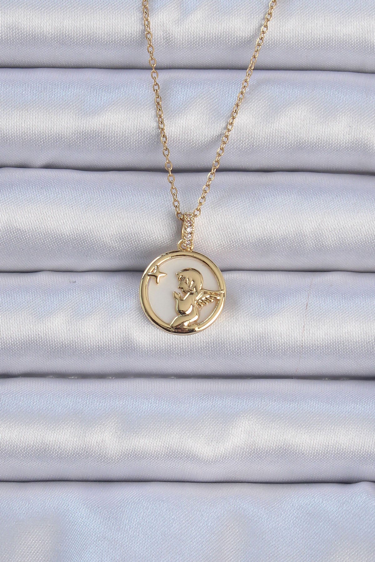BKO9085 - 316L Çelik Zincir Altın Renk Zirkon Taşlı Mineli Melek Kolye