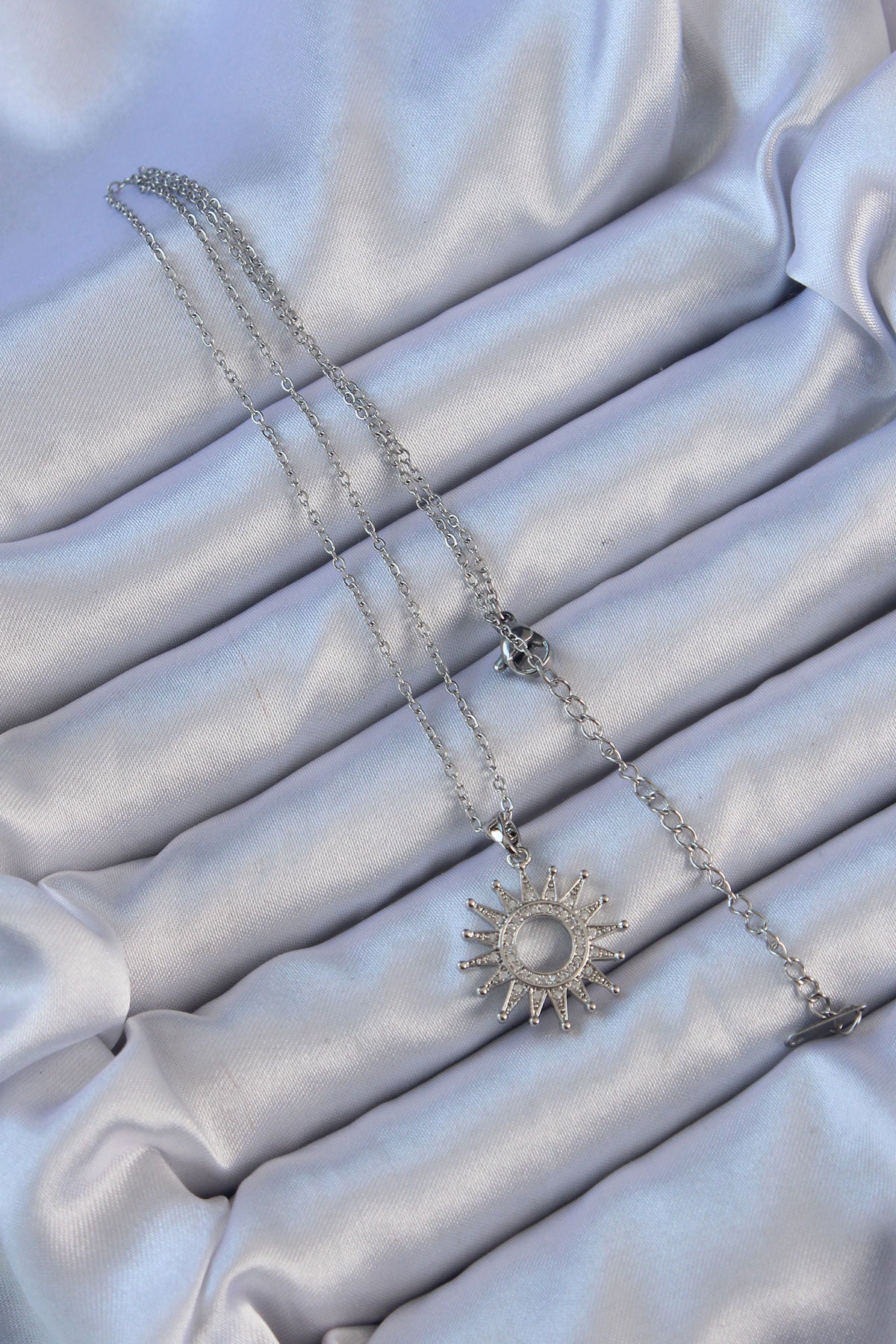 BKO9106 - 316L Çelik Zincir Gümüş Renk Zirkon Taşlı Parlayan Güneş Kolye