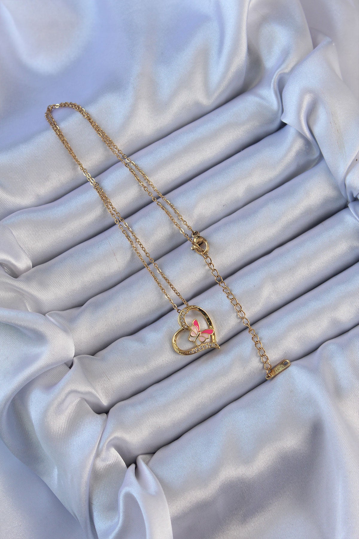 BKO9107 - 316L Çelik Zincir Altın Renk Mineli Kelebek Figür Zirkon Taşlı Kalp Kolye