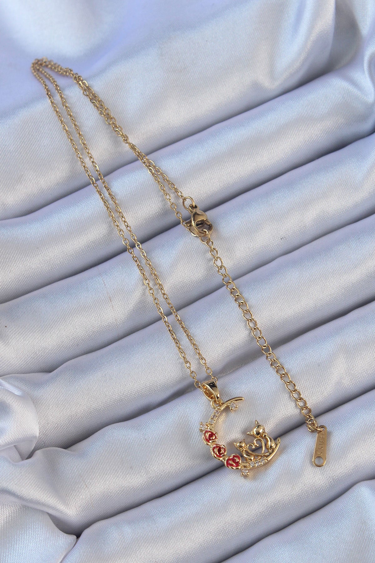 BKO9129 - 316L Çelik Zincir Altın Renk Kırmızı Gül Detay Kedi Figür Zirkon Taşlı Ay Kolye