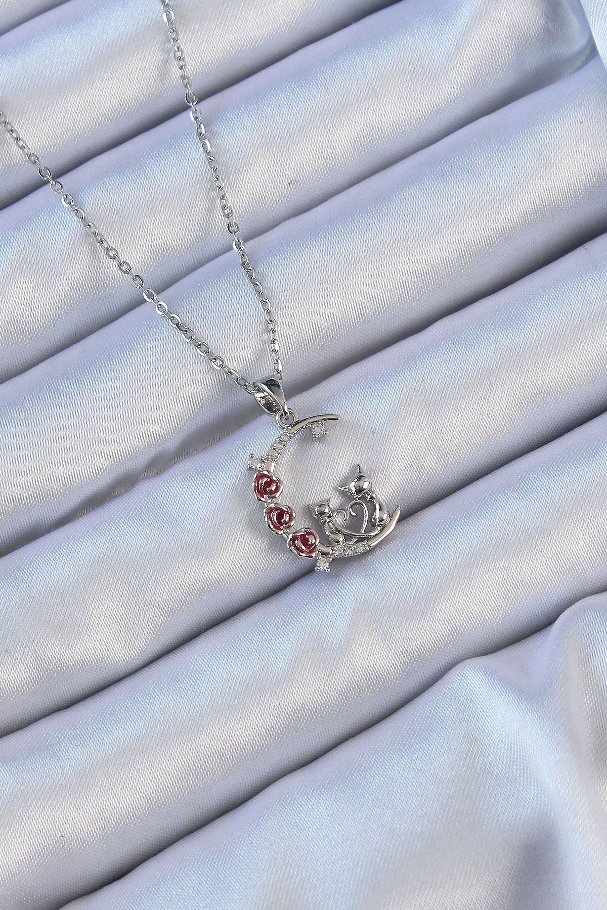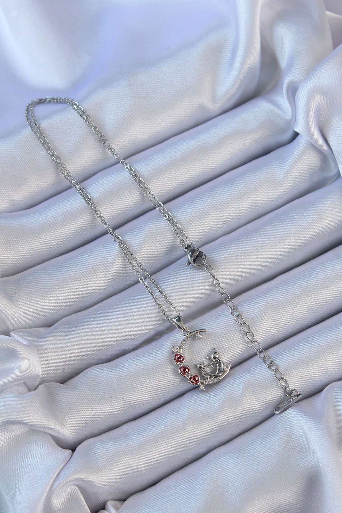 BKO9130 - 316L Çelik Zincir Gümüş Renk Kırmızı Gül Detay Kedi Figür Zirkon Taşlı Ay Kolye