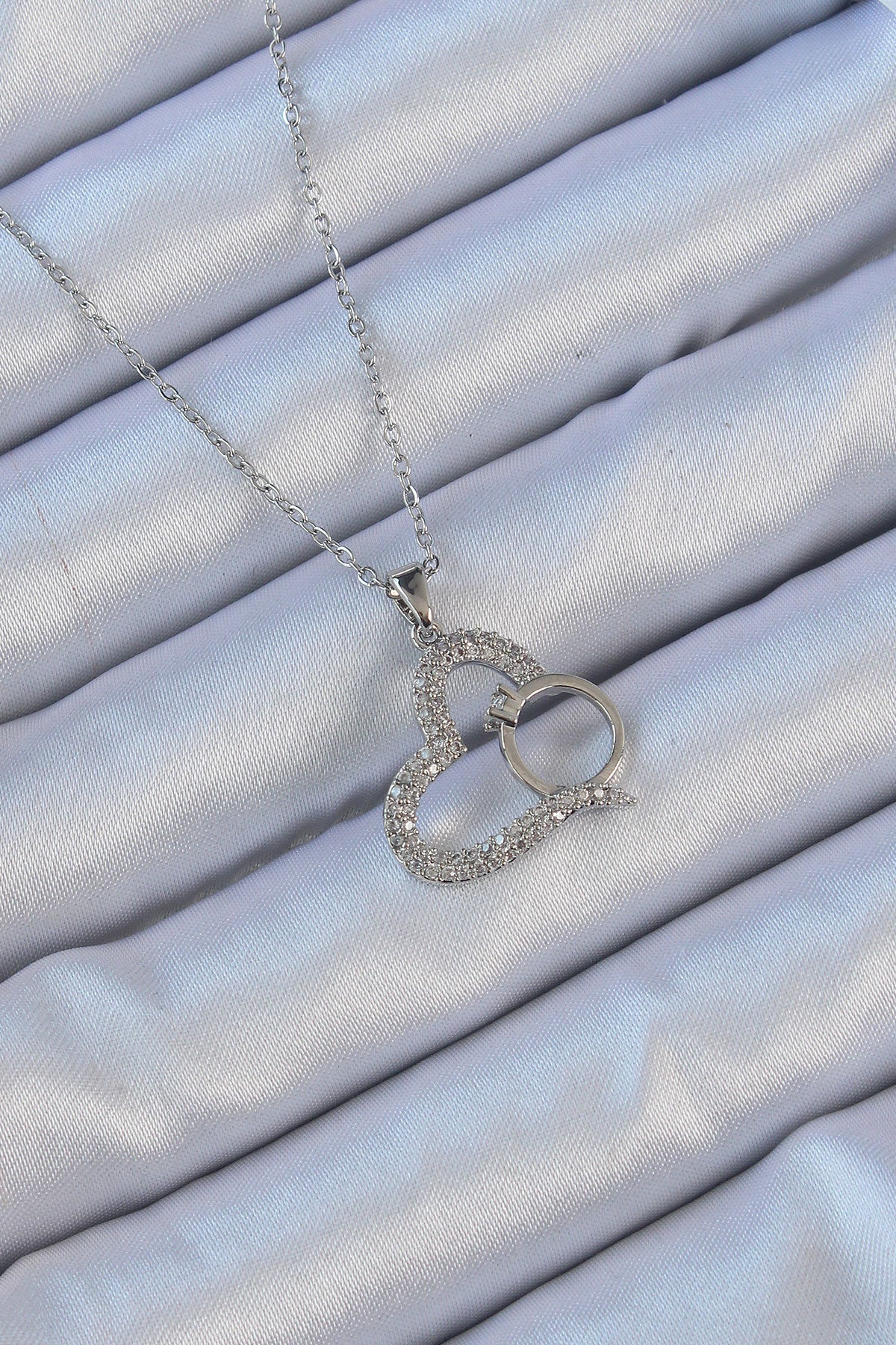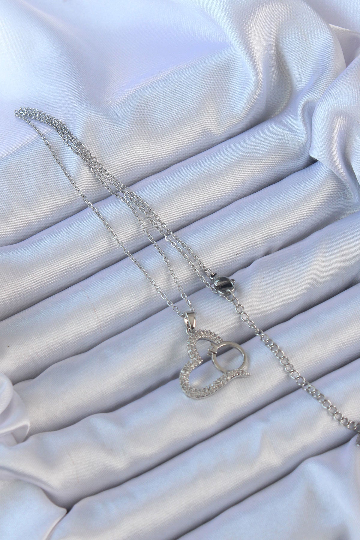 BKO9146 - 316L Çelik Zincir Gümüş Renk Zirkon Taşlı Yüzüklü Kalp Kolye