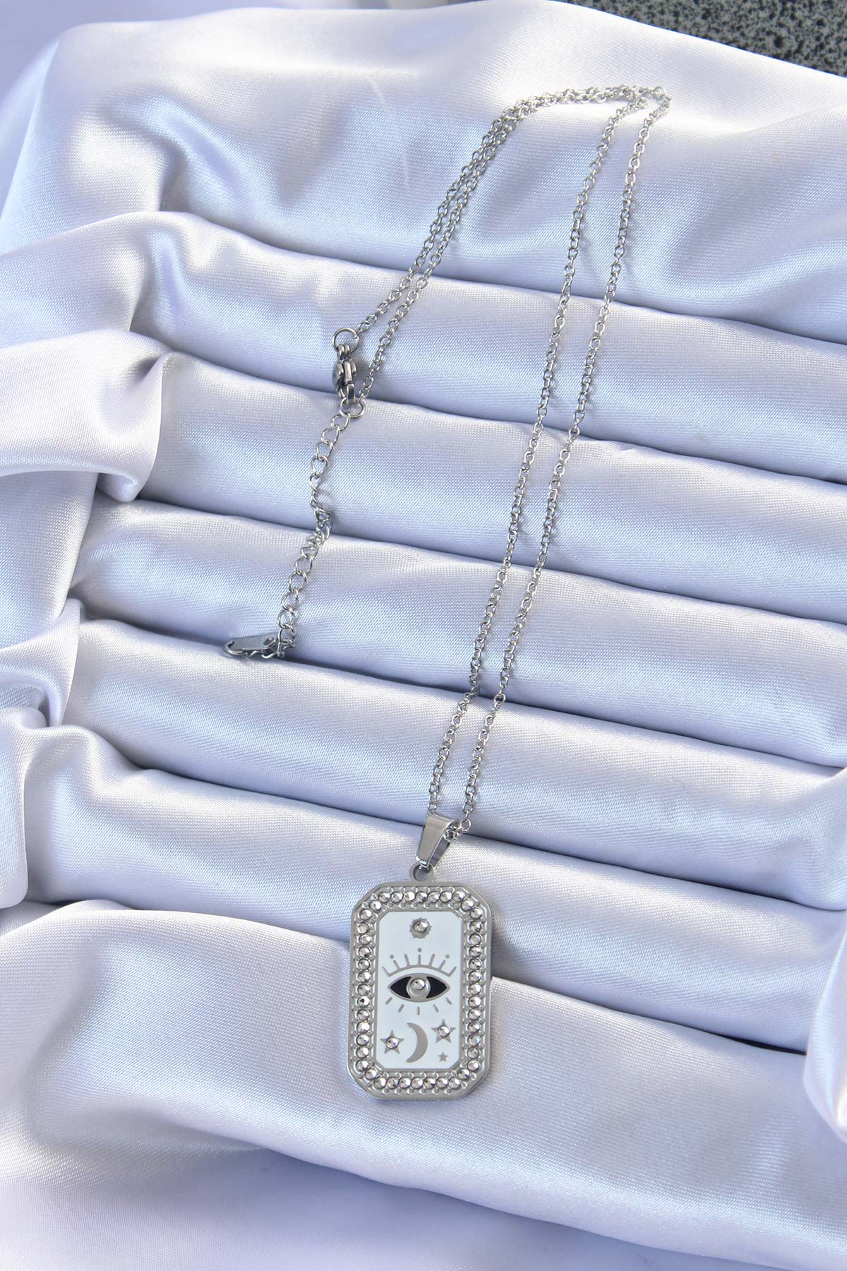 BKO9214 - 316L Çelik Zincir Gümüş Renk Mineli Zirkon Taşlı Göz Figür Tarot Kolye