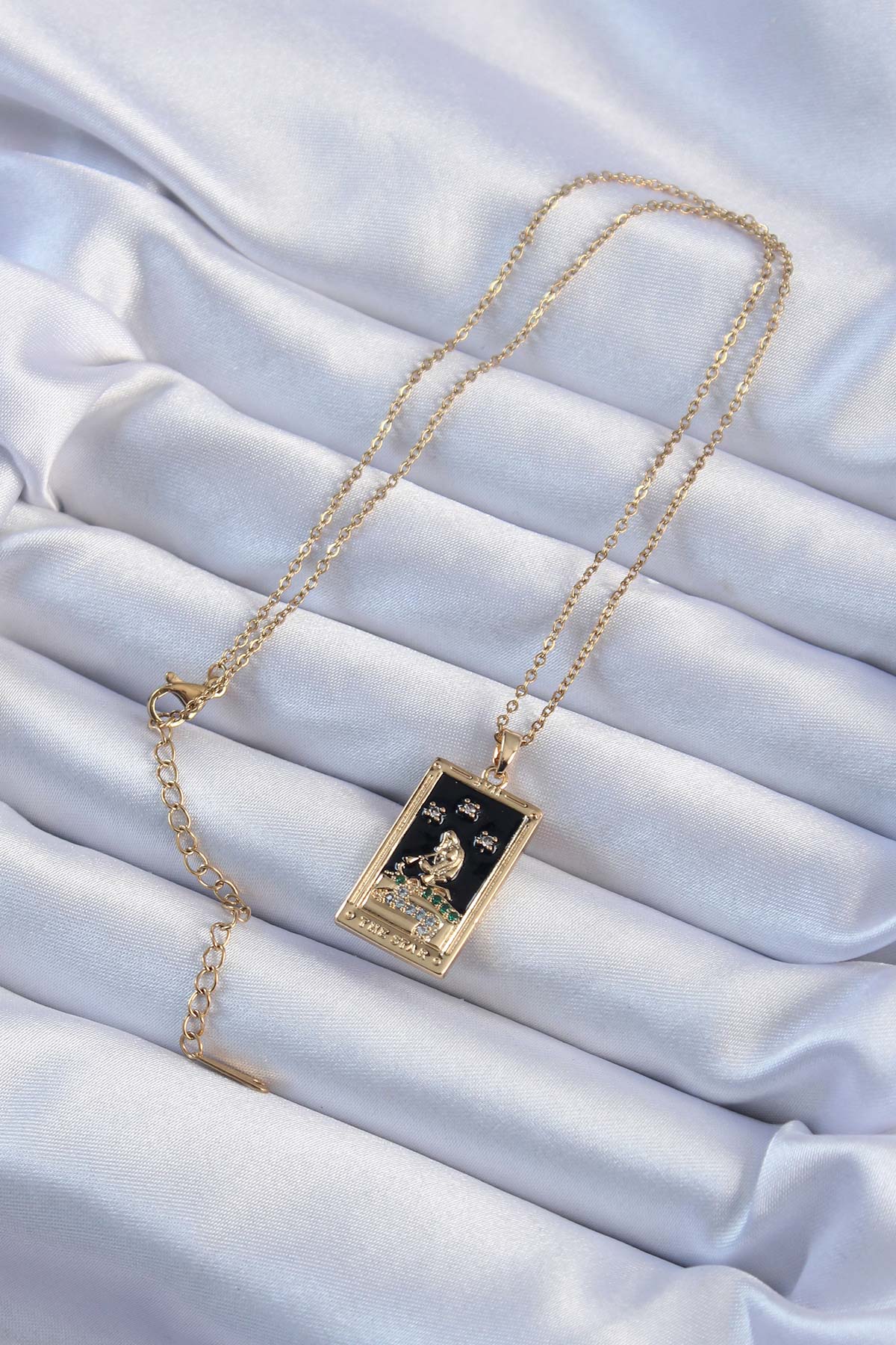 - Ürün Adı: 316L Çelik Zincir Altın Renk Zirkon Taşlı Siyah Mineli Kız Figürlü Tarot Kolye