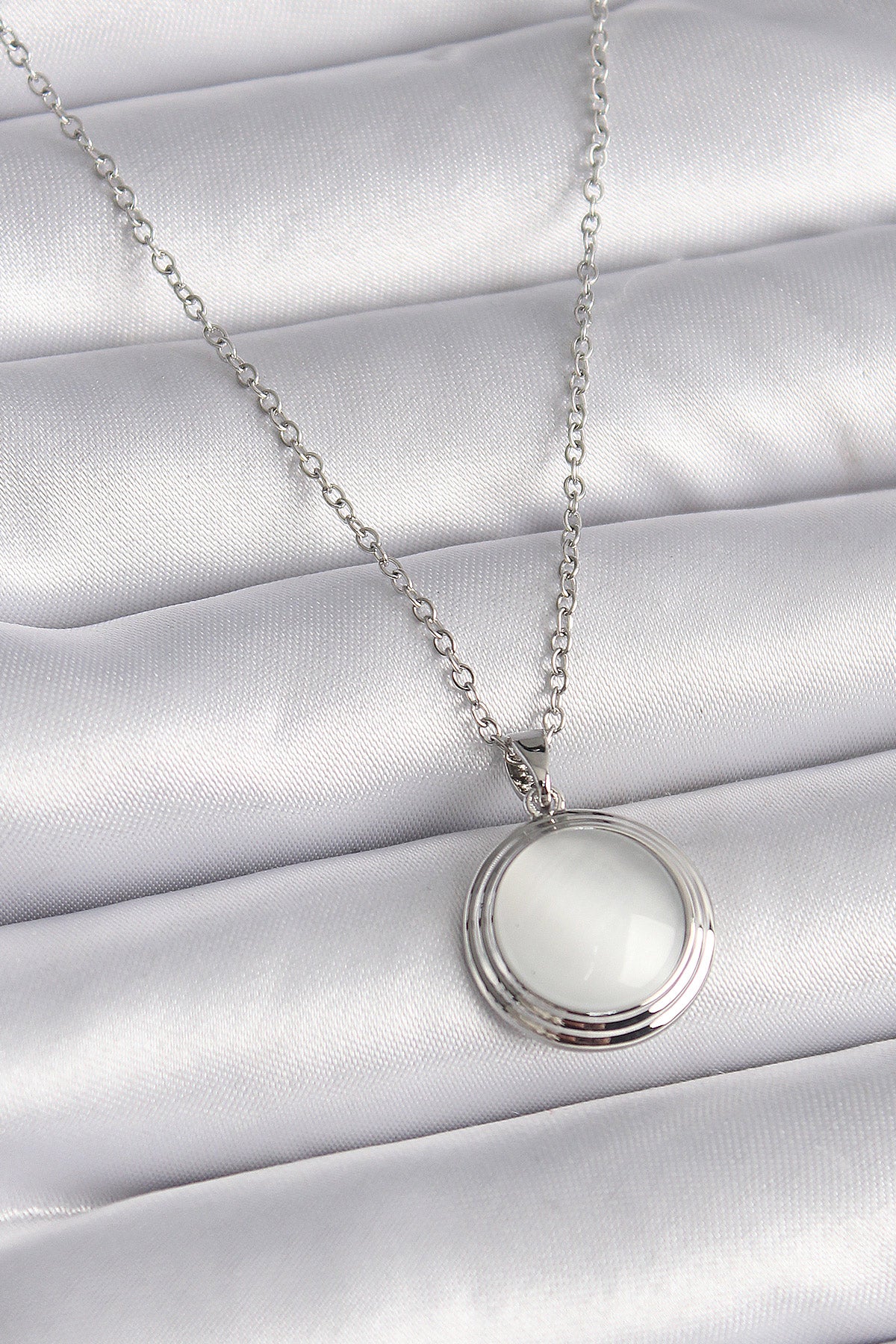 BKO9426 - 316L Çelik Gümüş Renk Beyaz Sedefli Daire Model Kadın Kolye