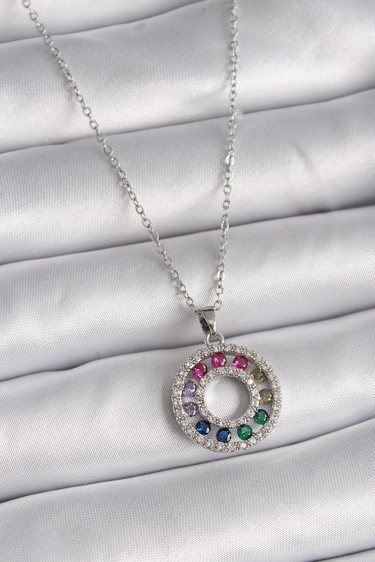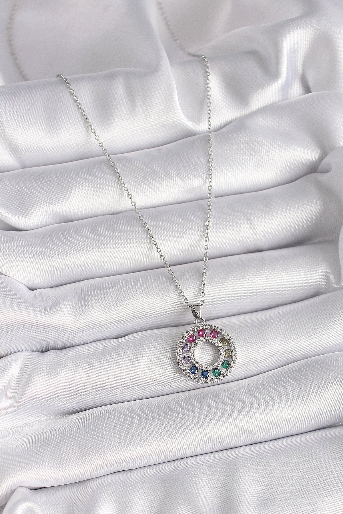 BKO9489 - 316L Çelik Gümüş Renk Zincir Renkli Zirkon Taşlı Madalyon Model Kadın Kolye