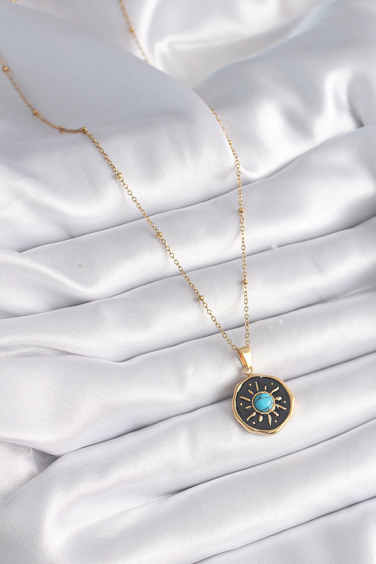 - Ürün Adı: 316L Çelik Gold Renk Mavi Boncuk Güneş İşleme Madalyon Model Kadın Kolye