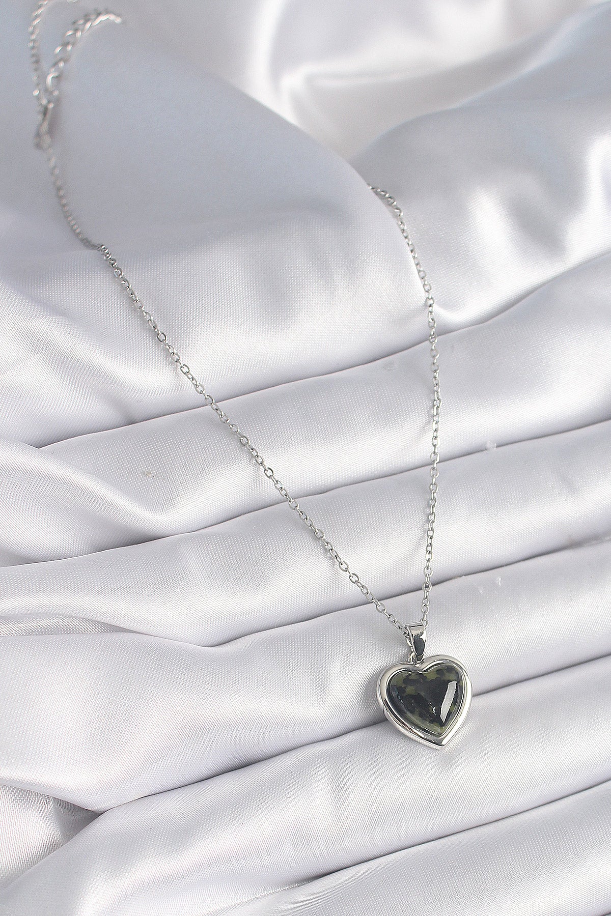 BKO9526 - 316L Çelik Gümüş Renk Yeşil Mineli Kalp Model Kadın Kolye