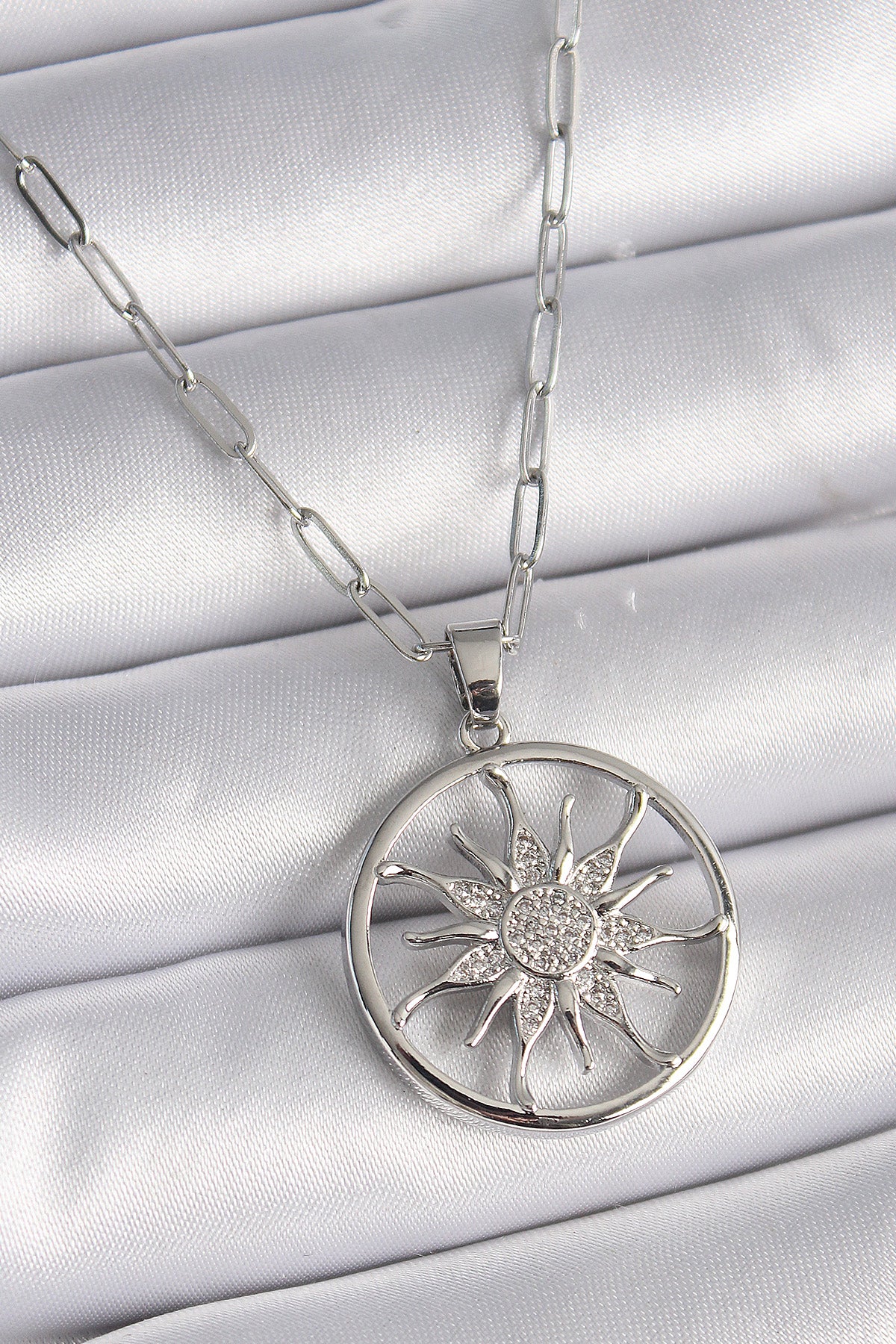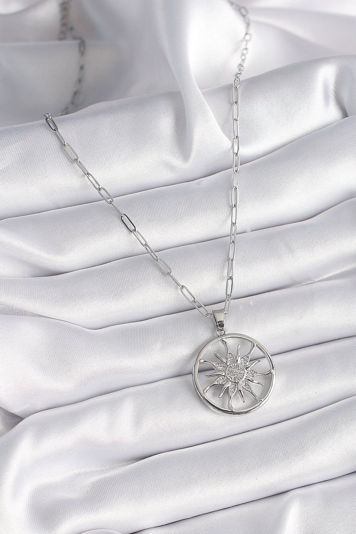 BKO9529 - 316L Çelik Gümüş Renk Zirkon Taşlı Güneş Madalyon Model Kadın Kolye