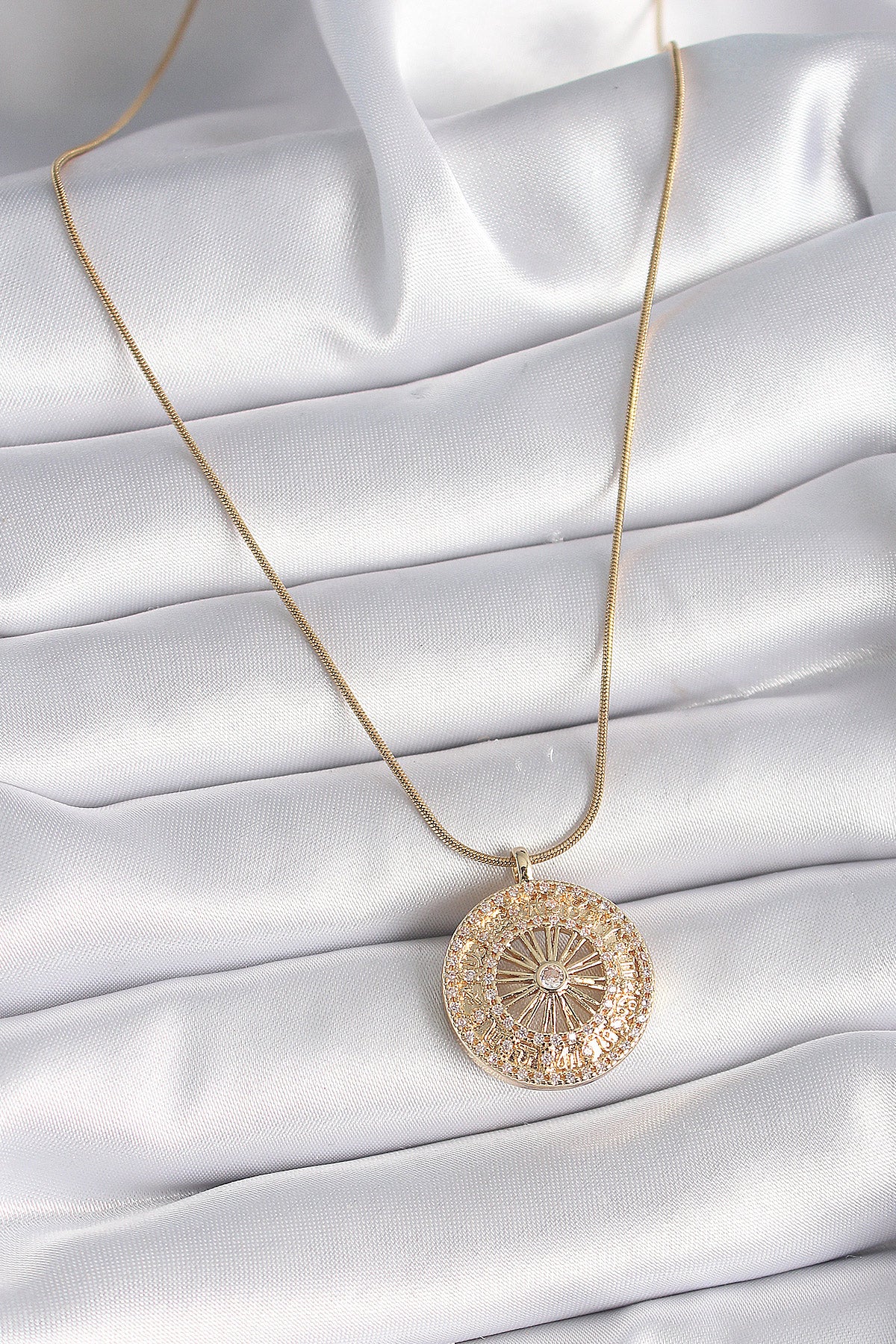 - Ürün Adı: 316L Çelik Gold Renk Zirkon Taşlı 12 Burç Madalyon Model Kadın Kolye