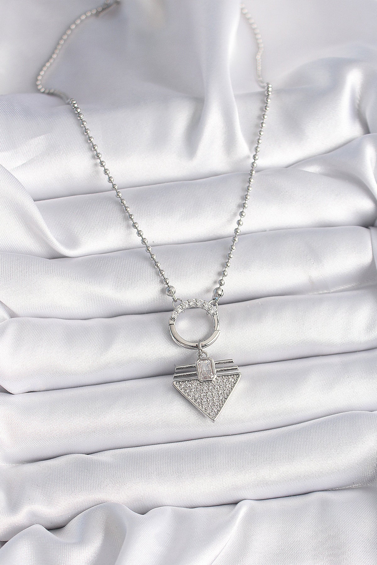 BKO9574 - 316L Çelik Gümüş Renk Topçuk Zincir Zirkon Taşlı Üçgen Model Kadın Kolye